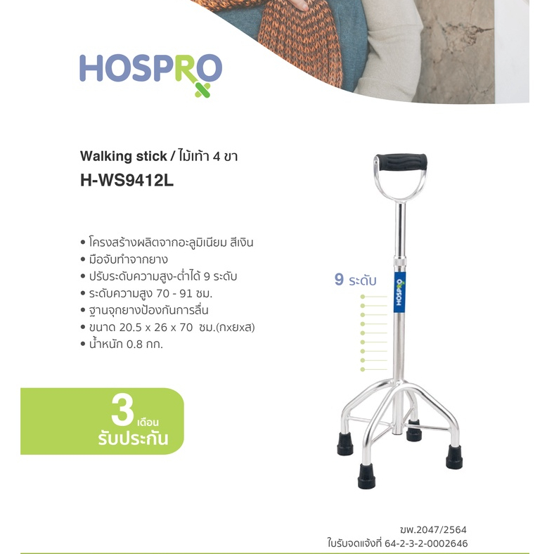 (HOSPRO) ไม้เท้า 4 ขา ด้ามจับถนัดมือ แข็งแรง Walking stick รุ่น H-WS9412L [รับประกัน 3 เดือน]