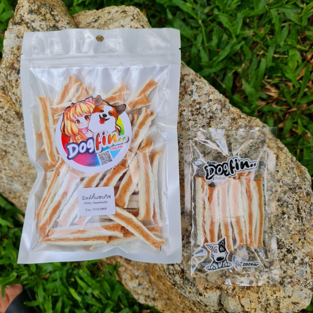 [สินค้าสั่งผลิต] Dogfin แซนวิชมิลล์กี้ มี 4 รสชาติ ขนมสำหรับน้องหมา เกรดส่งออก(SSM-แซนวิชแซลมอน,50 กรัม)