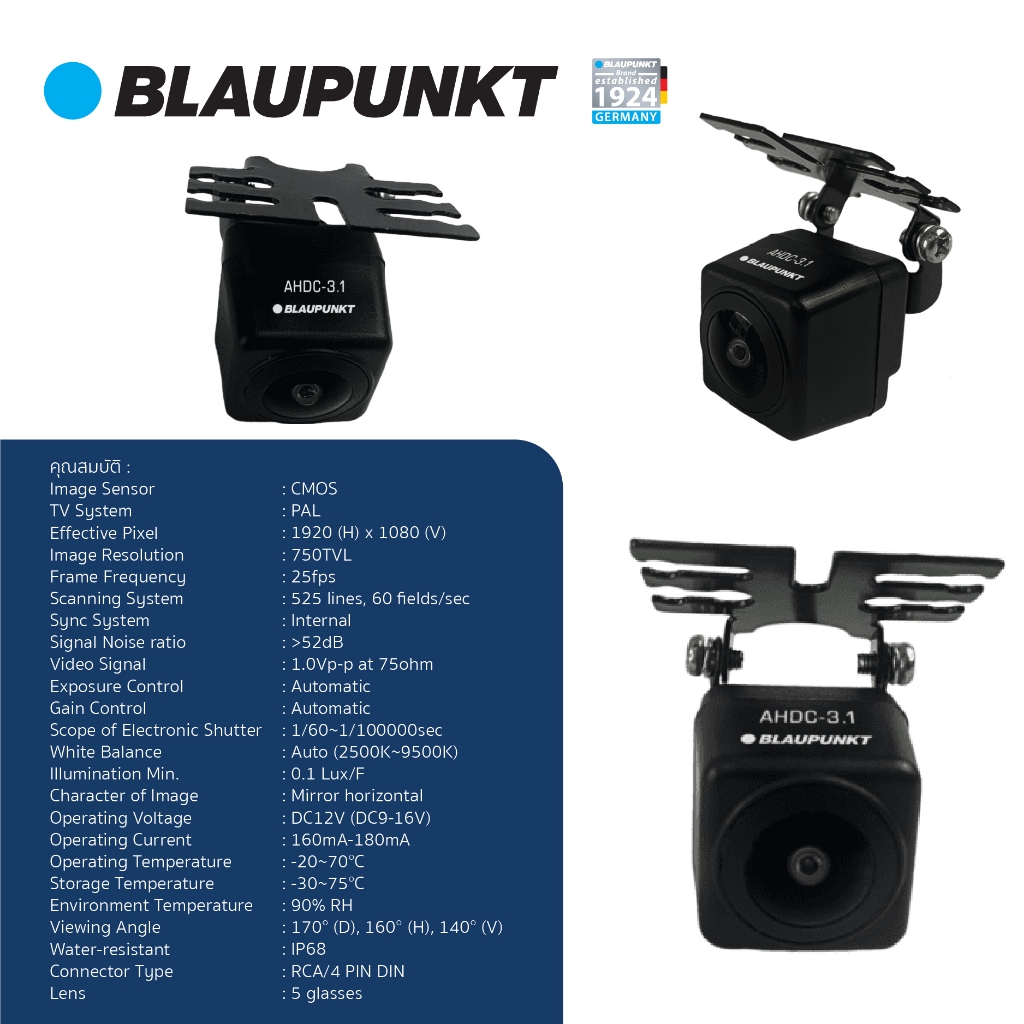 BLAUPUNKT กล้องถอยหลังติดรถยนต์รุ่น AHDC 3.1 มุมมอง 170 องศา สามารถกันน้ำระดับ IP68 เลนส์มี 5 ระดับ