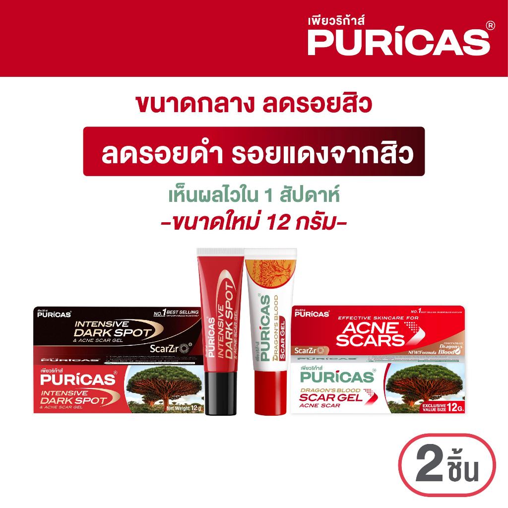 [แพ็คคู่ ขนาดใหม่12กรัม ] เซ็ตลดเลือนรอยสิว Puricas Intensive Dark Spot 12g.+ Puricas Scar gel 12g.