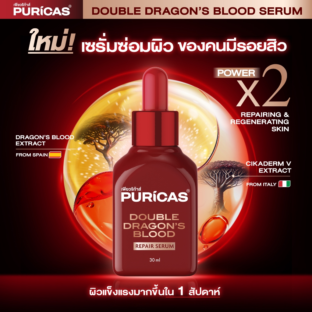 Puricas Double Dragon's Blood Repair Serum 30ml.+Scar gel 8g. เซ็ตคู่ ซ่อมผิวพัง ลดเลือนรอยแ ดงจากสิว