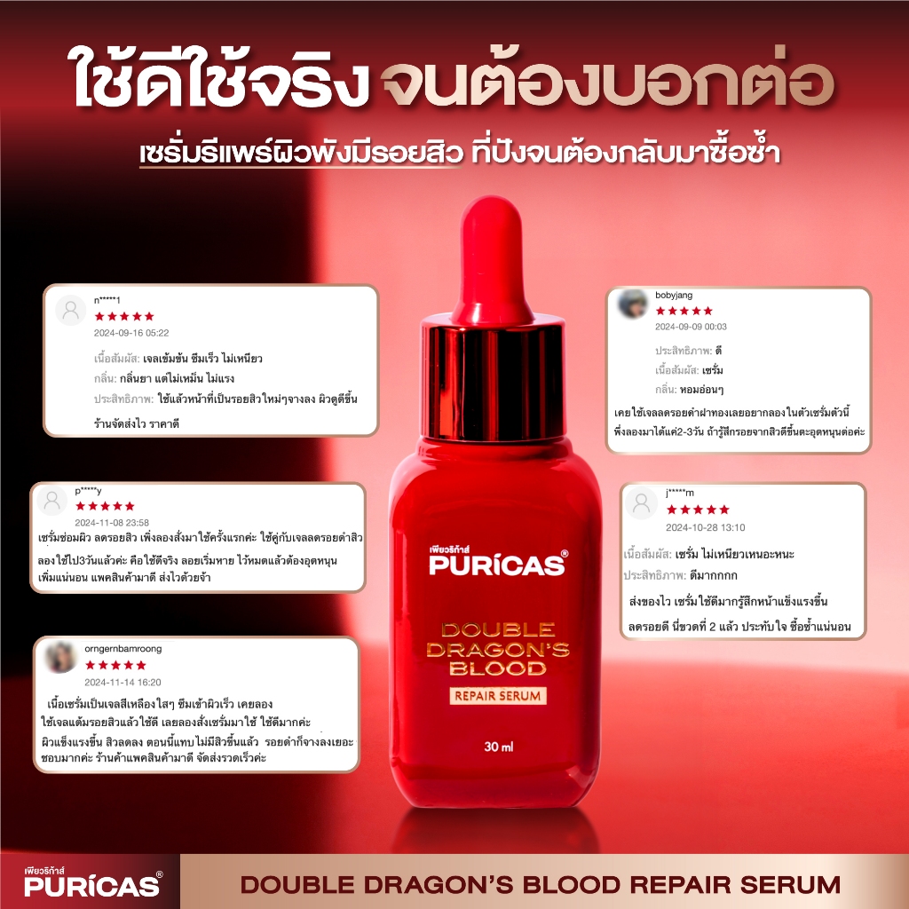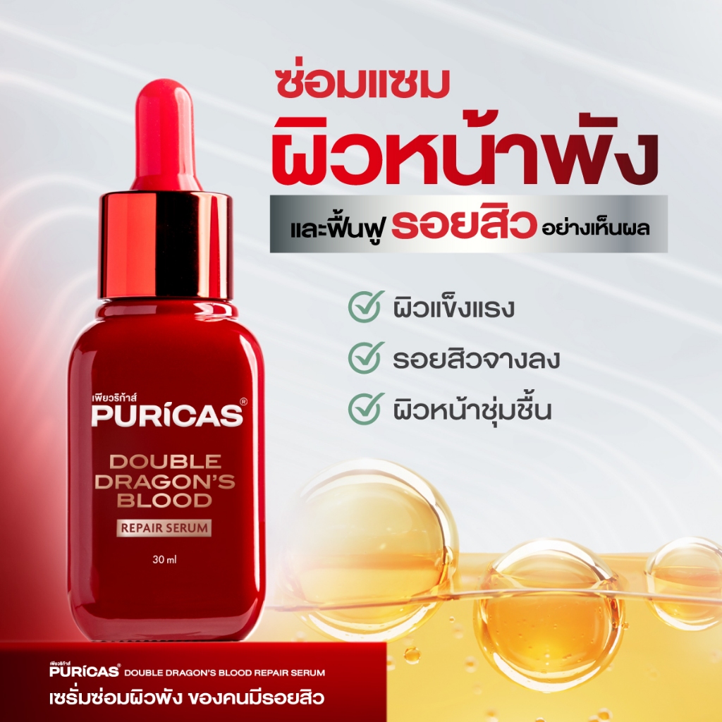 Puricas Double Dragon's Blood Repair Serum 30ml. เซรั่มซ่อมผิวพัง ลดเลือนรอยสิว