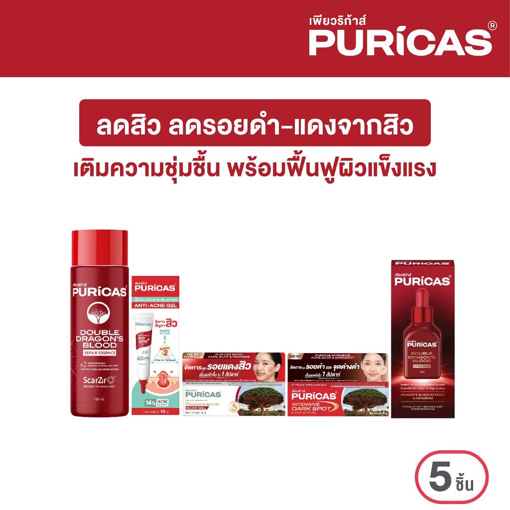 Puricas Double Essence 100ml.+Acne gel 10g. + Scar gel 8g.+ Intensive 8g.+ Double Dragon's Blood Serum 30ml.