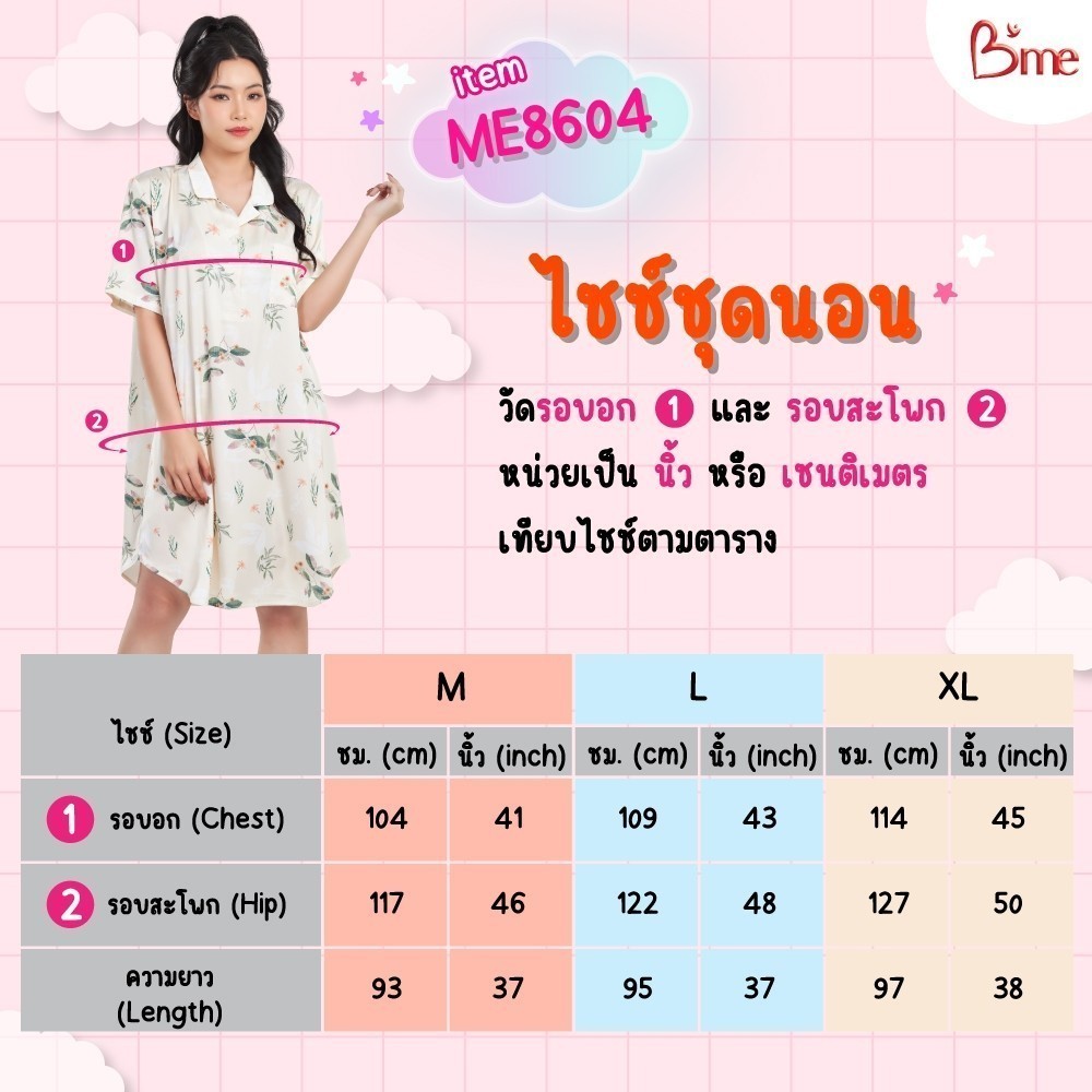 B'me ชุดนอนรูปแบบกระโปรงแขนสั้น คอปกฮาวาย รุ่น ME8604 มี 4 สี สีเขียว สีโอลด์โรส สีฟ้า สีเหลือง