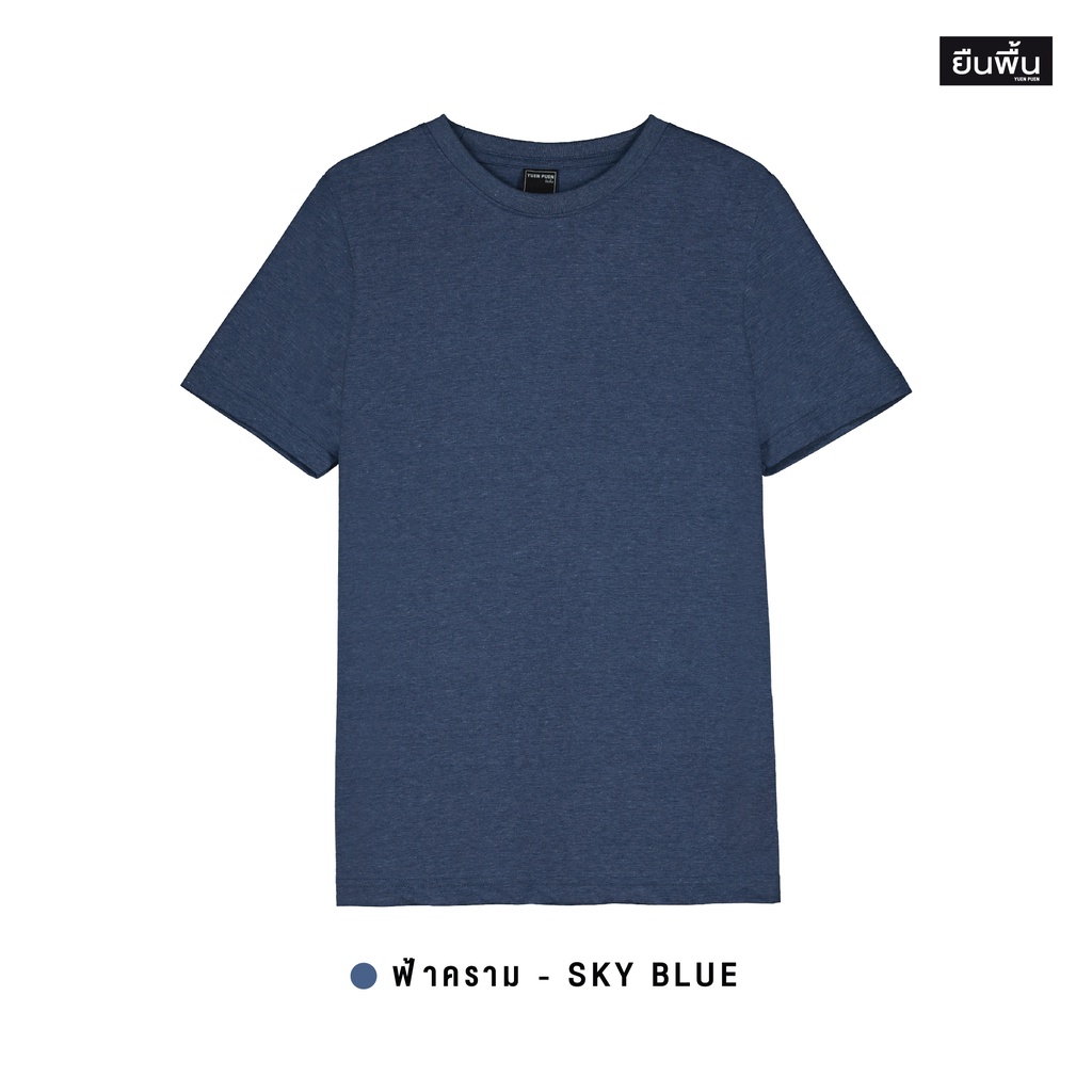 YuenPuen เสื้อยืดคอกลม สีฟ้าคราม ยืนพื้น ไม่ยืด ไม่ย้วย ไม่ต้องรีด สีพื้น เนื้อผ้านุ่มใส่สบาย