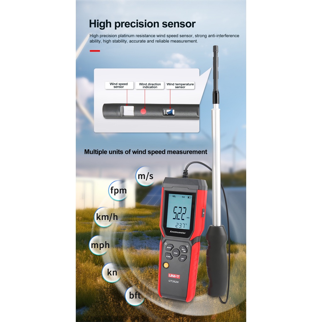 Uni-t UT362H เครื่องวัดความเร็วลมลวดร้อน 0m/s ~ 30m/s Wind Velocity Flow เครื่องวัดอุณหภูมิปิดอัตโนมัติ
