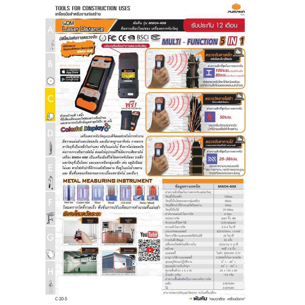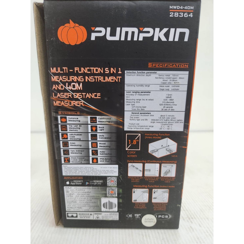 เครื่องสแกนผนัง ตรวจจับวัดถุ 5 in 1 มีเรเซอร์วัดระยะ 40เมตร PUMPKIN รุ่น 28364 / MWD4-40M