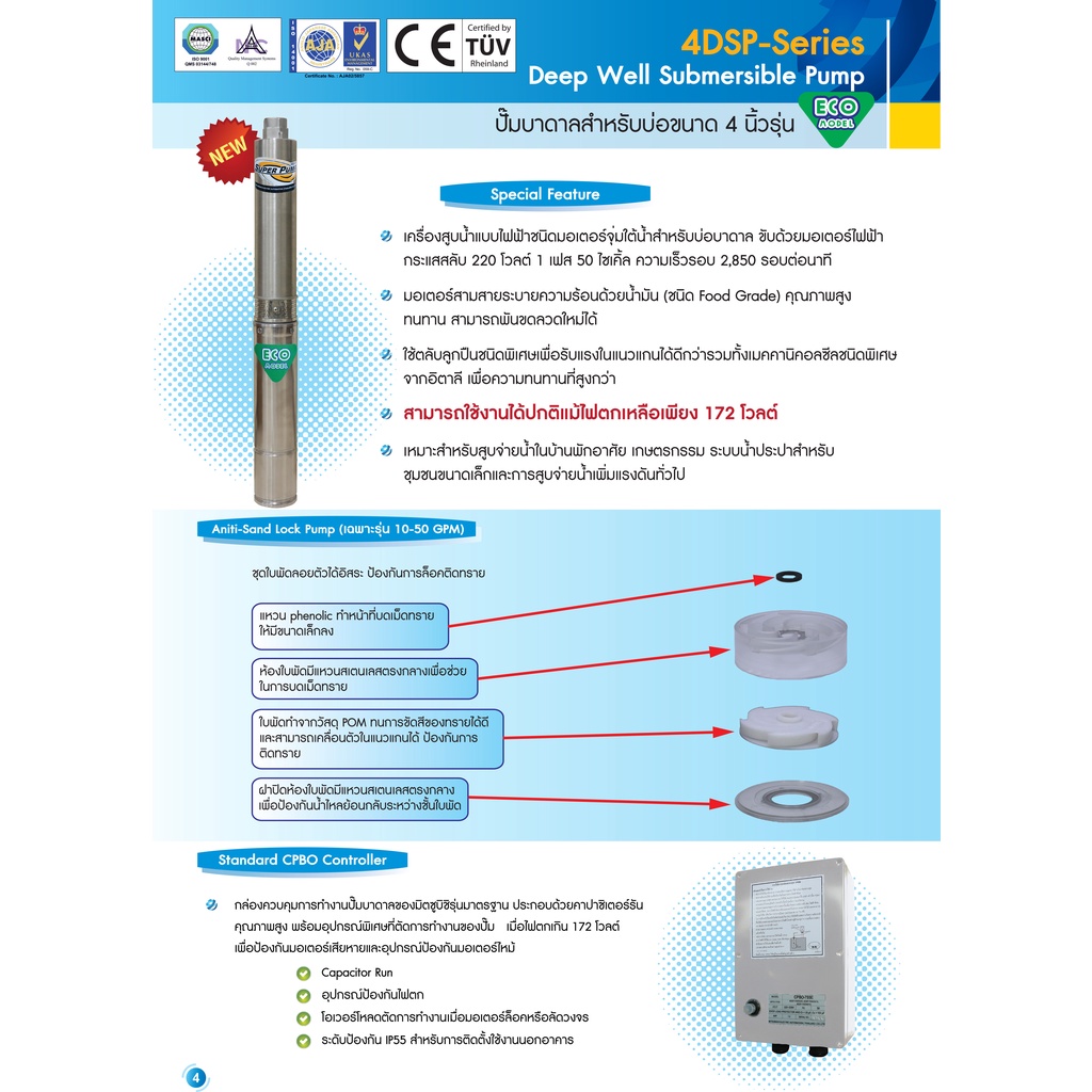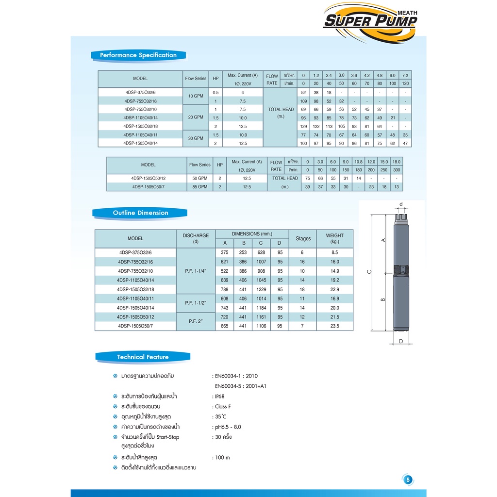 ปั้มน้ำบาดาล ซับเมอร์สไฟฟ้า บ่อ 4นิ้ว กำลัง 1 - 2Hp ขนาด 1.1/4" - 2" ยี่ห้อ SUPER PUMP by MITSUBISHI