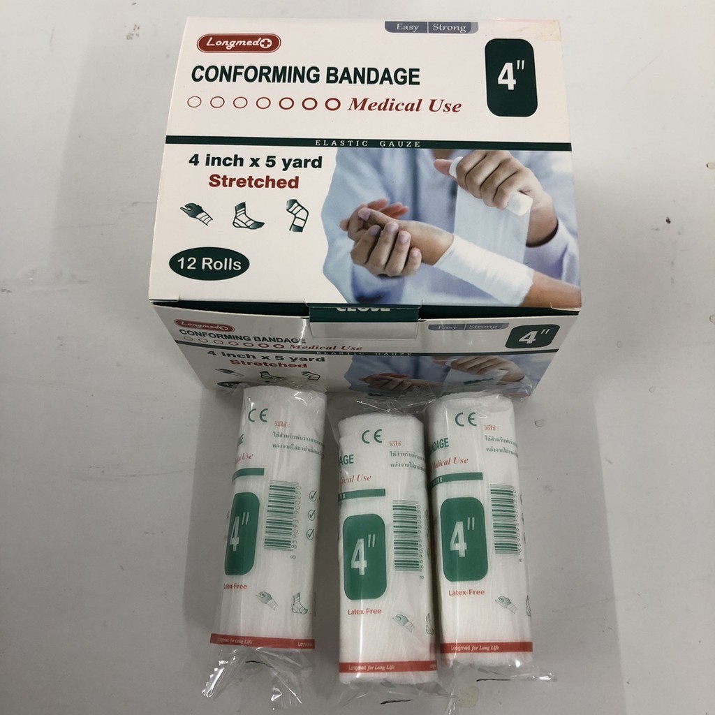 (ยกกล่อง 12 ม้วน) Longmed Conforming Bandage Elastic Gauze ลองเมด ผ้ายืดพันแผล ขนาด 4 นิ้ว x 5 หลา