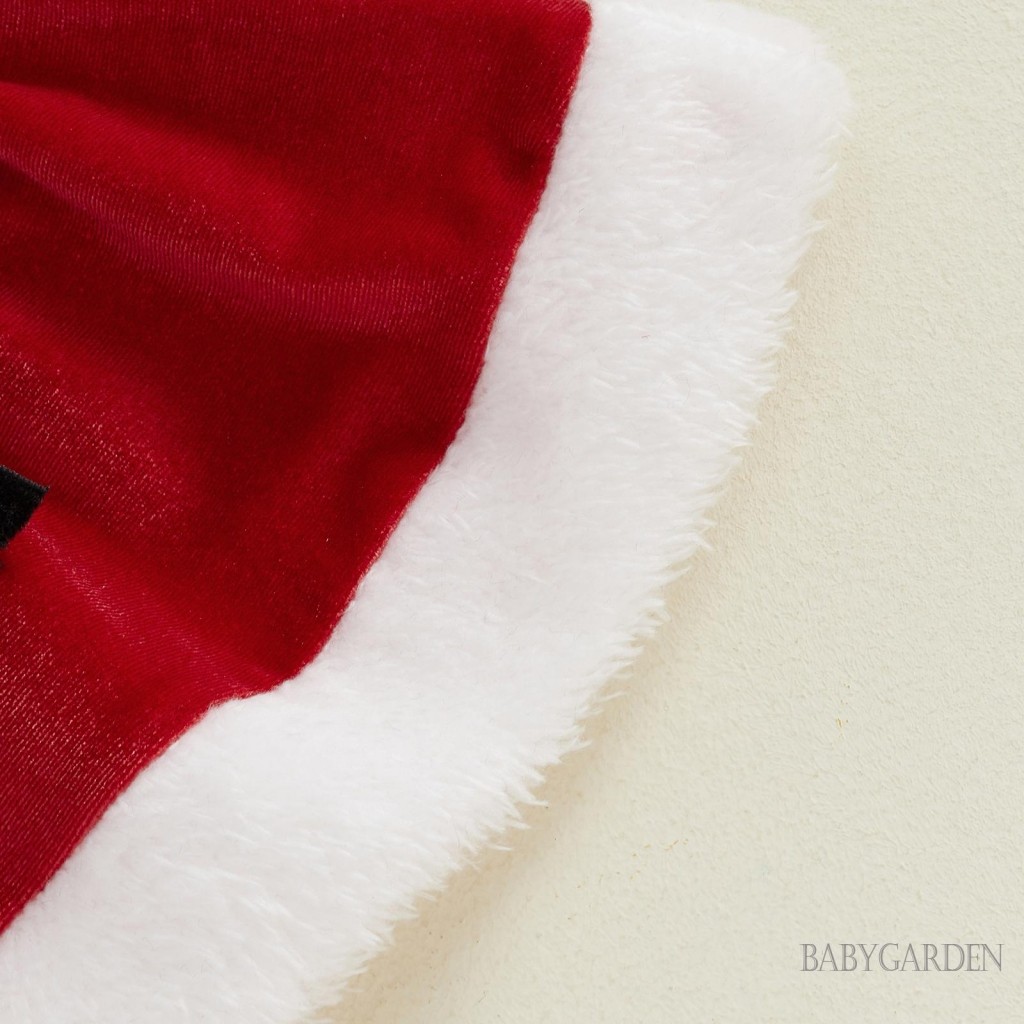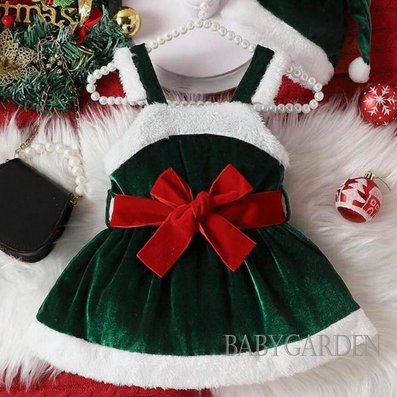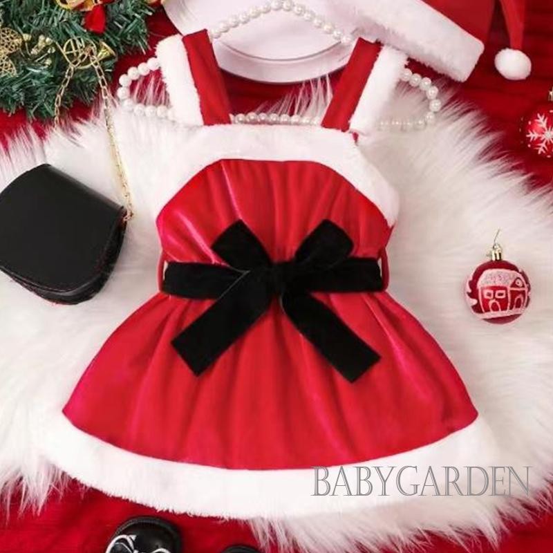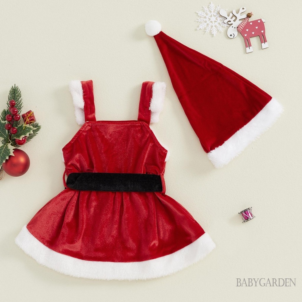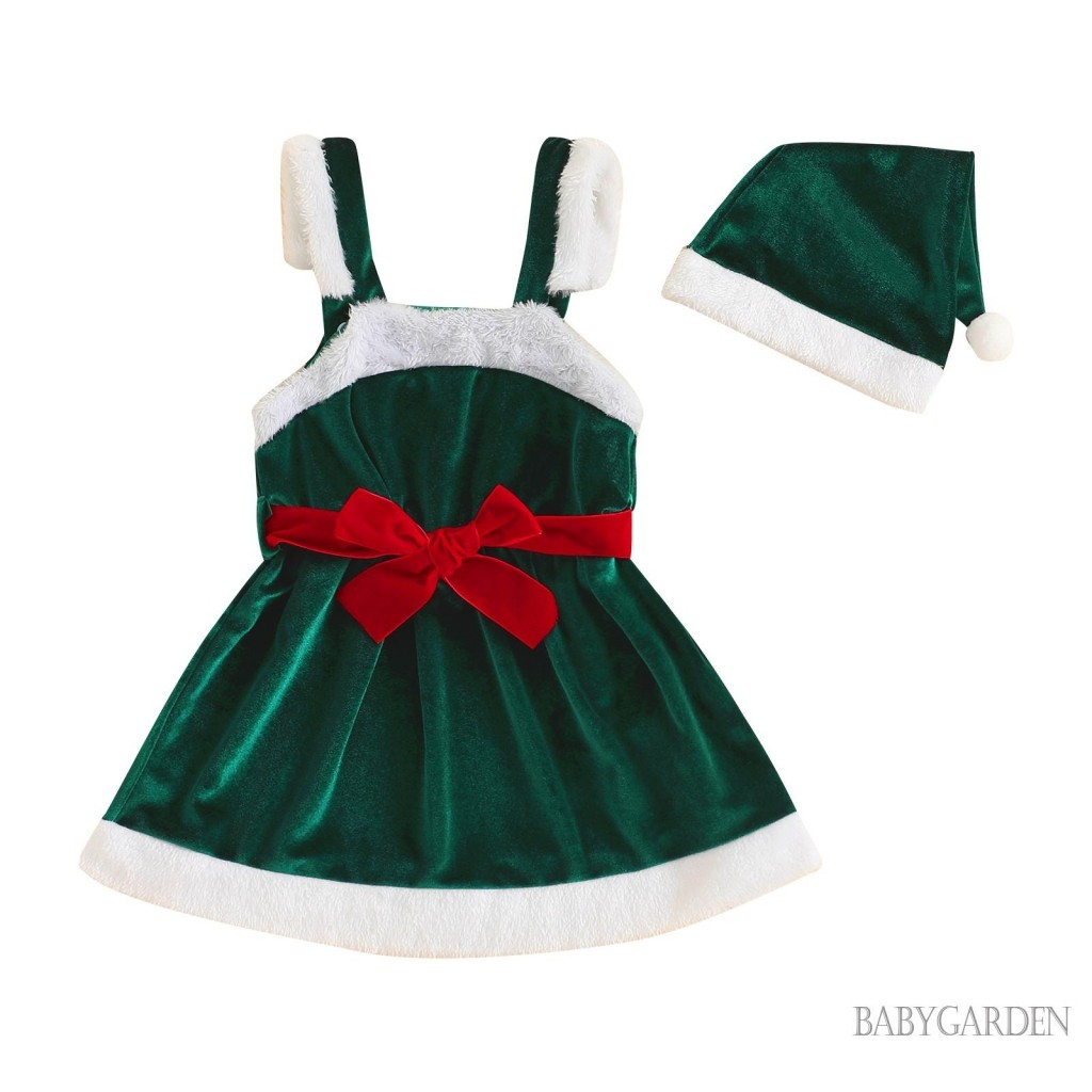 【ส่งจากไทย】ชุดเดรสสายเดี่ยวทรงเอแขนกุดผ้ากำมะหยี่แต่งเทอร์รี่โบว์คาดเอว + หมวก สำหรับเด็กผู้หญิง อายุ 6 เดือน - 3 ปี