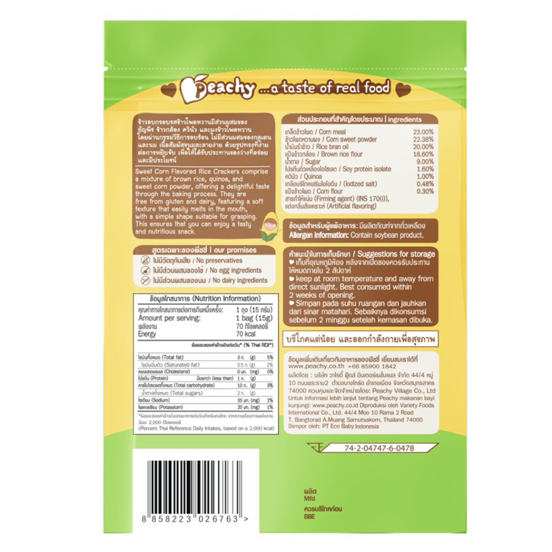 Peachy ข้าวอบกรอบ สำหรับเด็ก 10 เดือนขึ้นไป ช็อกโกบานาน่า ข้าวโพดหวาน ขนมเด็ก ขนมข้าวอบ Rice Cracker