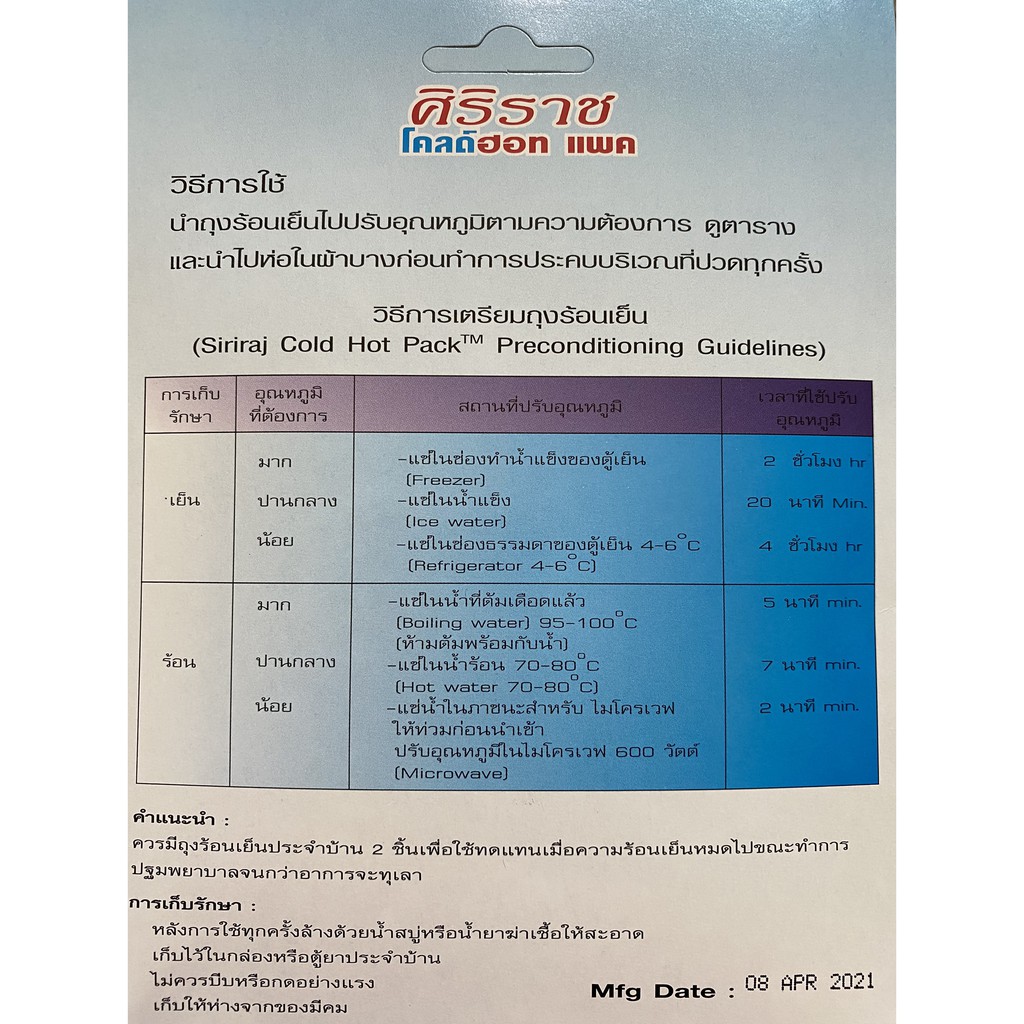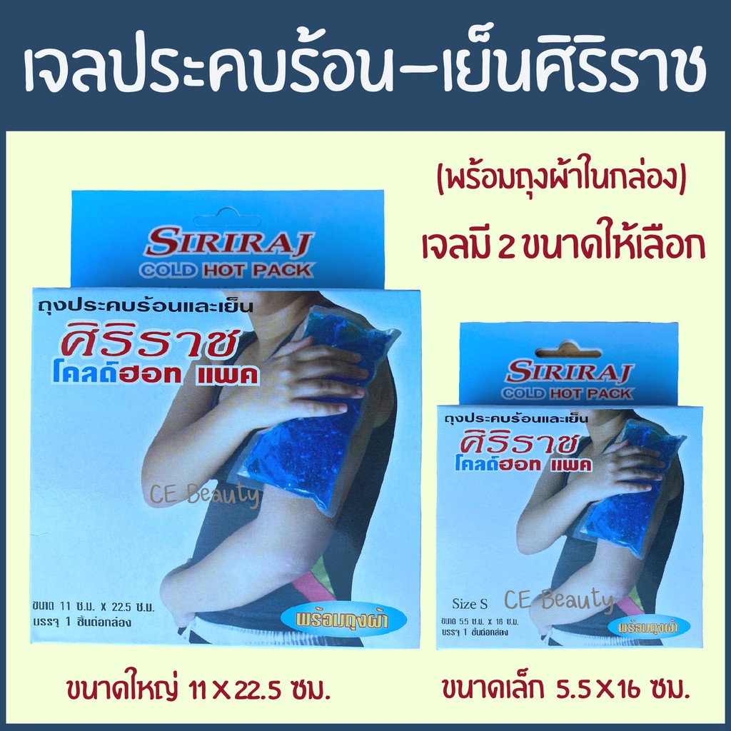 ศิริราช เจลแพค เจลประคบร้อน-เย็น Gelpack มีถุงผ้าในกล่องค่ะ มี 2 ขนาด เล็ก 5.5*16 ซม. ใหญ่ 11*22.5 ซม.