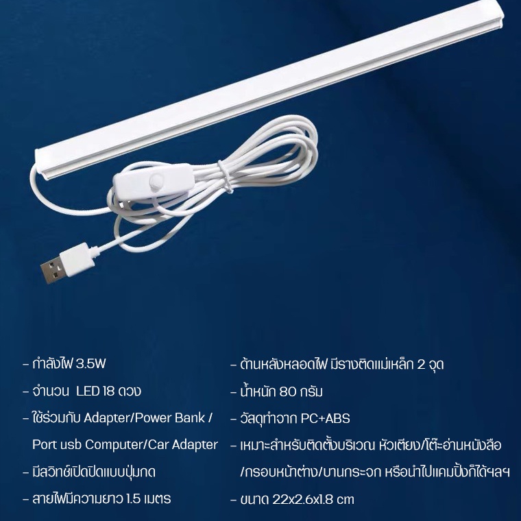 หลอดไฟUSB LED แสงไฟสีขาว สว่างกินไฟน้อย พร้อมแม่เหล็กติดตั้งสะดวก ไฟหอพัก ตู้เสื้อผ้าตู้ดชว์