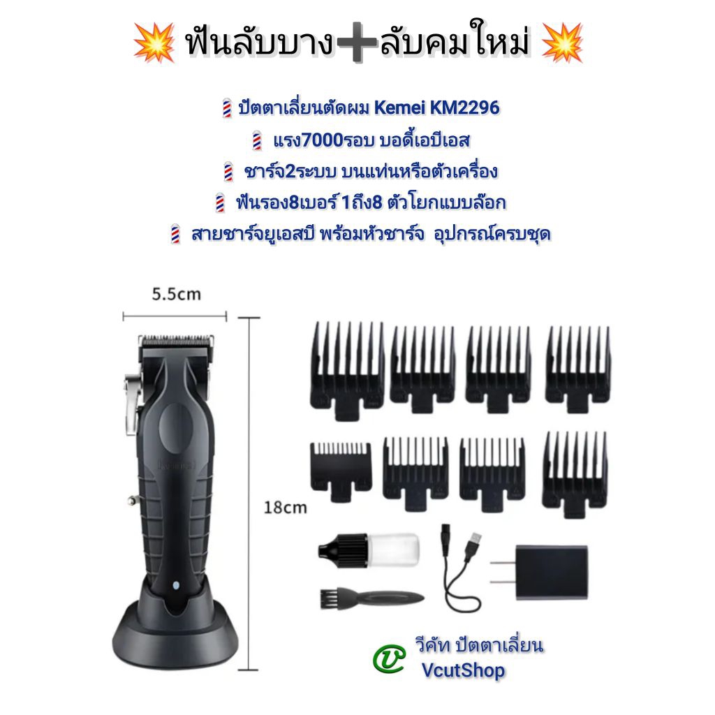 (#5 วีคัท) Kemei KM2296 ปัตตาเลี่ยนตัดผม+แท่นชาร์จ ฟันรอง8เบอร์ ลับบางลับคมเพิ่ม