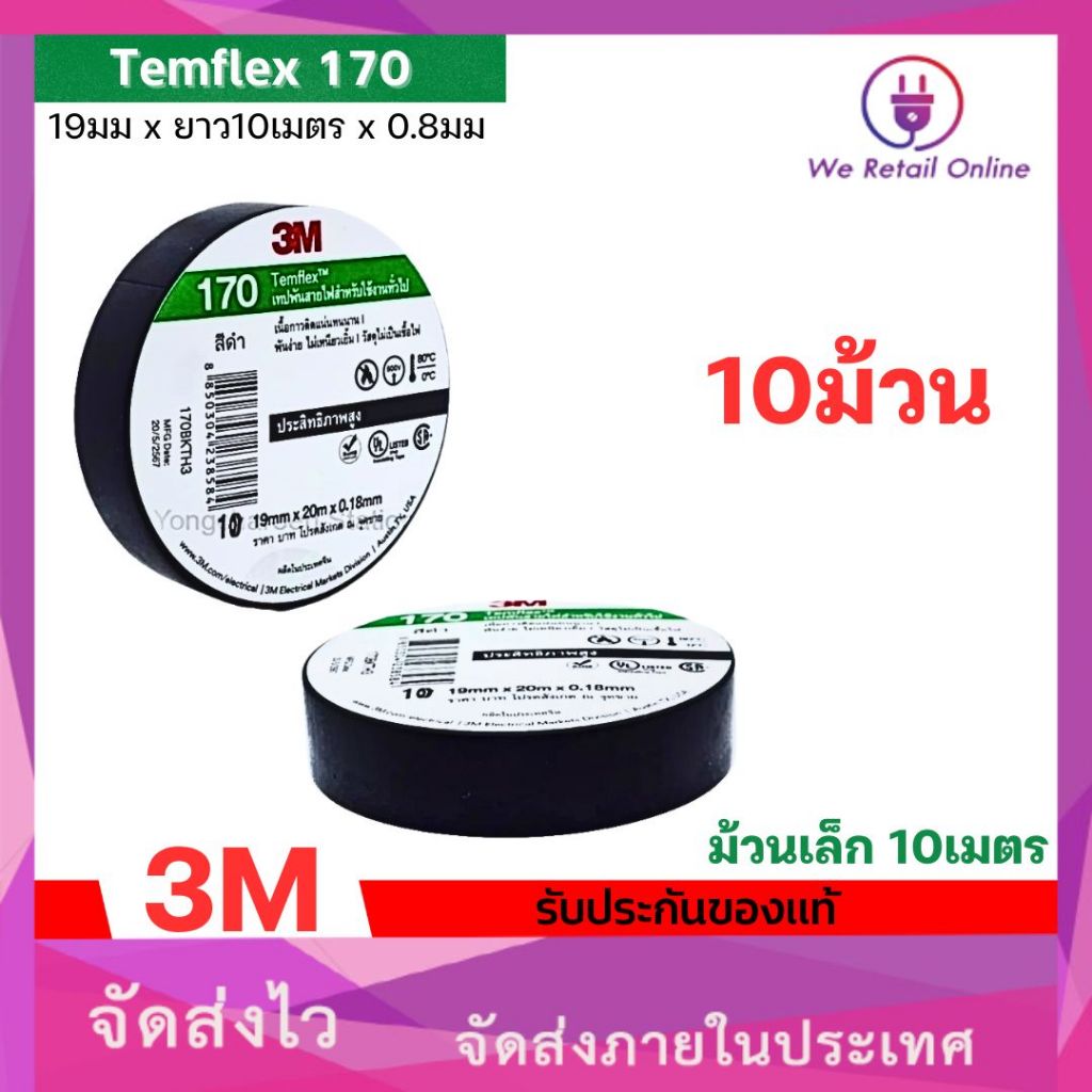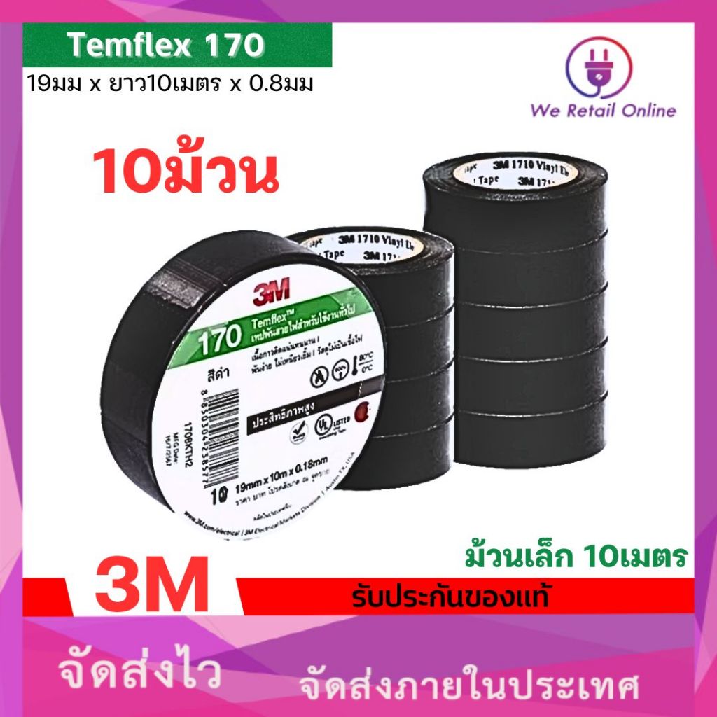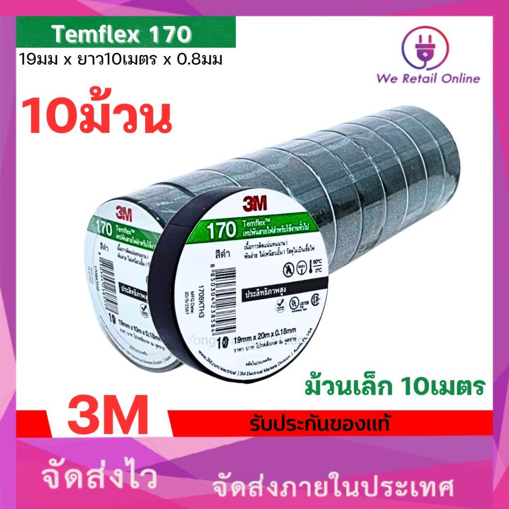 เทปพันสาย 3M รุ่น 170 Temflex 10 เมตร กาวเหนียวเเน่น ไม่เยิ้ม (ราคา/10ม้วน)