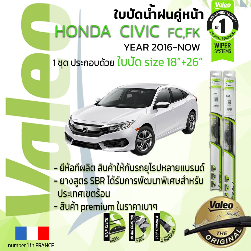 🔥 ใบปัดน้ำฝน คู่หน้า VALEO FIRST ก้านอ่อน สำหรับรถ HONDA CIVIC FC FK ขนาด 18”+26” ปี 2016-NOW