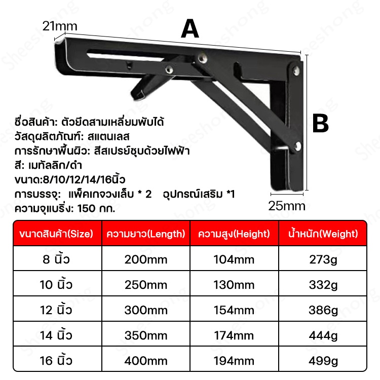 2ชิ้น เหล็กฉาก 8/10/12/14/16นิ้ว ฉากรับชั้นพับเก็บได้ ฉากพับเหล็ก ฉากพับ ชั้นวางติดผนัง