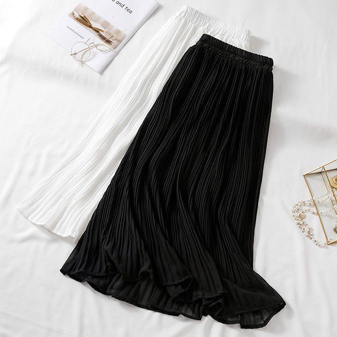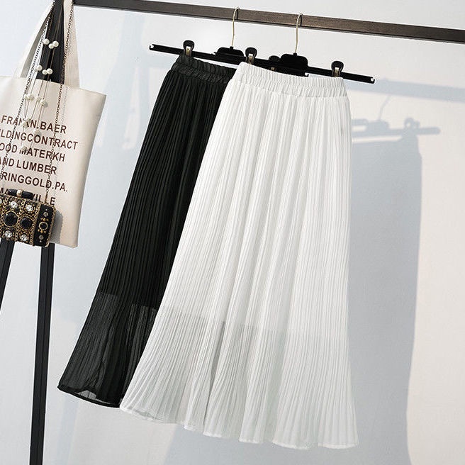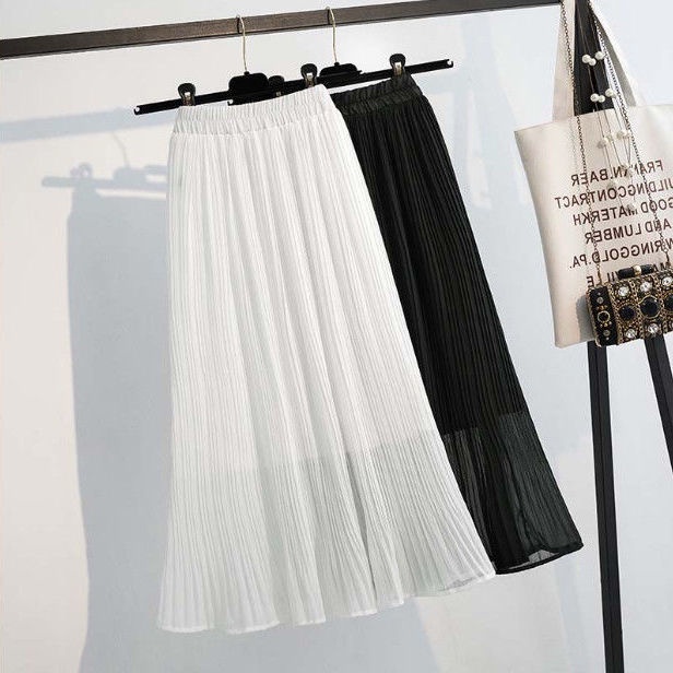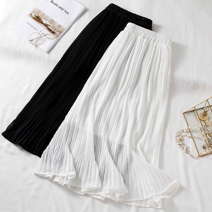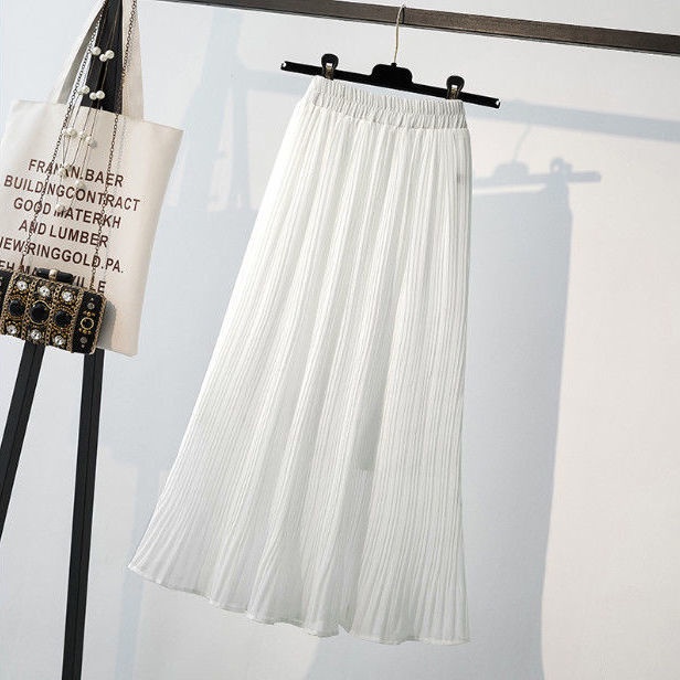 ชุดกระโปรงสําหรับสตรีผ้าชีฟองเอวสูงจับจีบสีพื้นสไตล์เกาหลี
