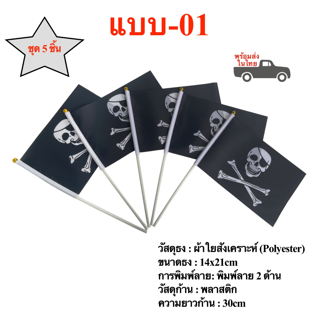 ธงโจรสลัด 5 แบบ พร้อมก้านถือ ชุด 5 ชิ้น ธงผ้า Pirates Flag 14x21cm ก้านยาว 30cm