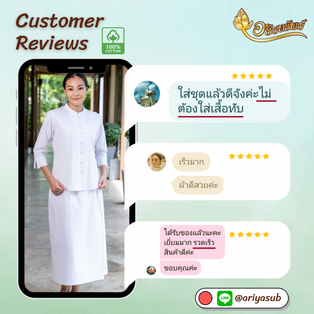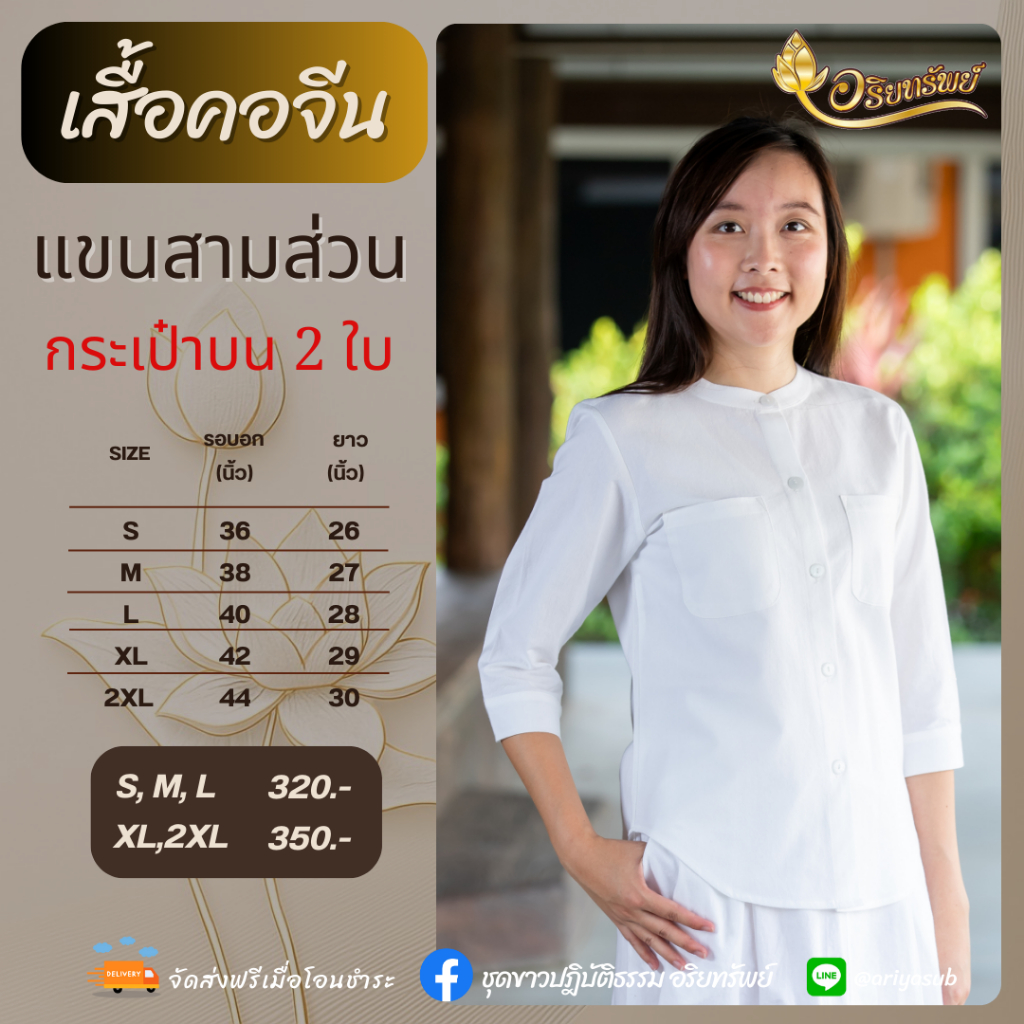เสื้อคอจีนแขนสามส่วนกระเป๋าบน 2 ข้าง ชุดขาวปฏิบัติธรรมผ้าฝ้ายแท้ ใส่สบาย ไม่ร้อน