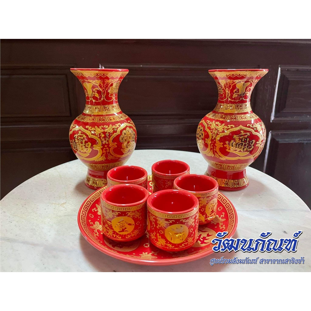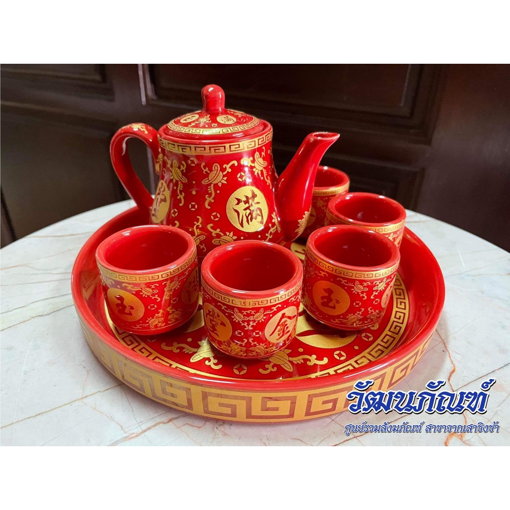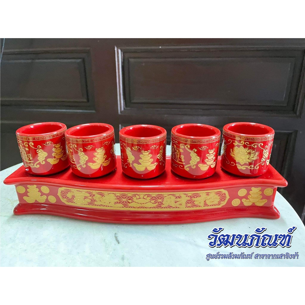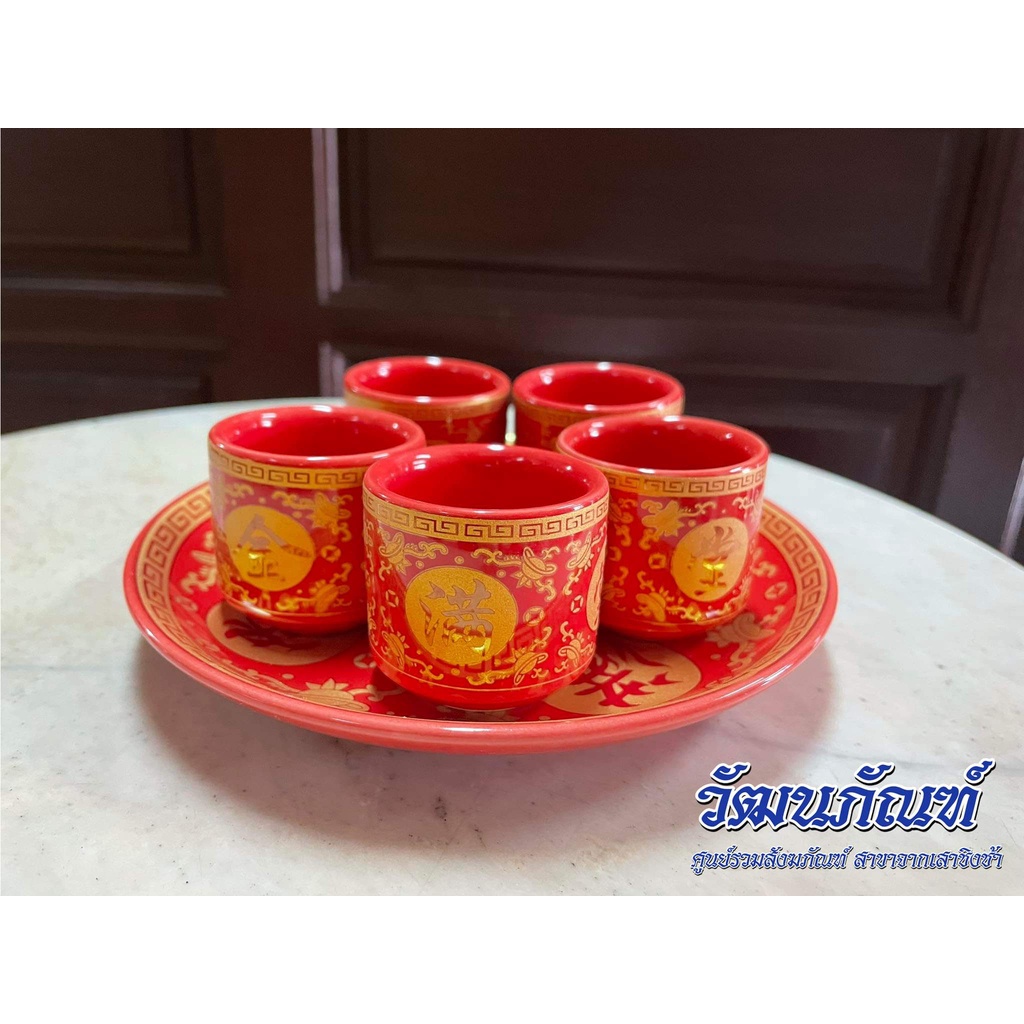 ชุดถ้วยน้ำชาเซรามิค จอกชาจีน ถ้วยน้ำชาไหว้เจ้า 5ใบ สีแดง (มีหลายแบบ)