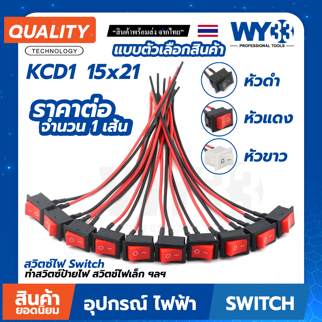 สวิตซ์ไฟ+สายไฟ(ประมาณ 10cm) POWER KCD1 ขนาด 15x21 แบบตัวเลือกหัวสี (บรรจุ 1 เส้น) ทำสวิตซ์ Switch ON-Off KCD1