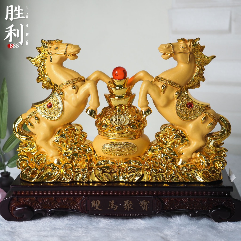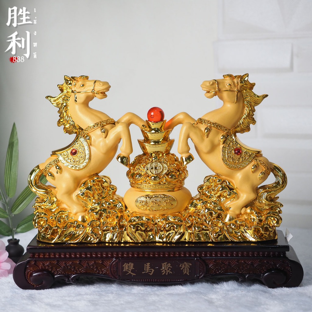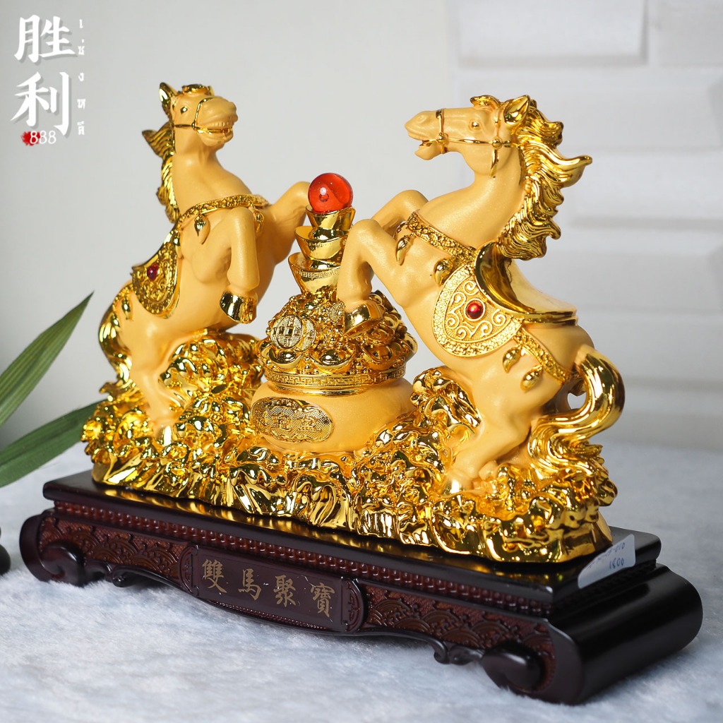 ม้า ม้าทอง ปีมะเมีย 2569 ม้าคู่ ยกขา พร้อมกระถางทองสมบัติ งานเรซิ่นพ่นทรายทอง มีมา 3 ขนาด 9/13/17 นิ้ว