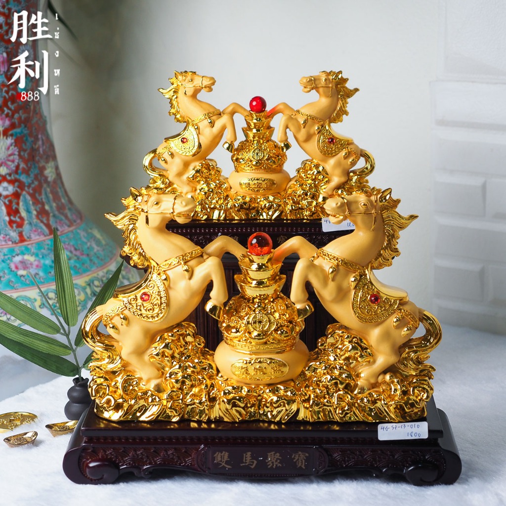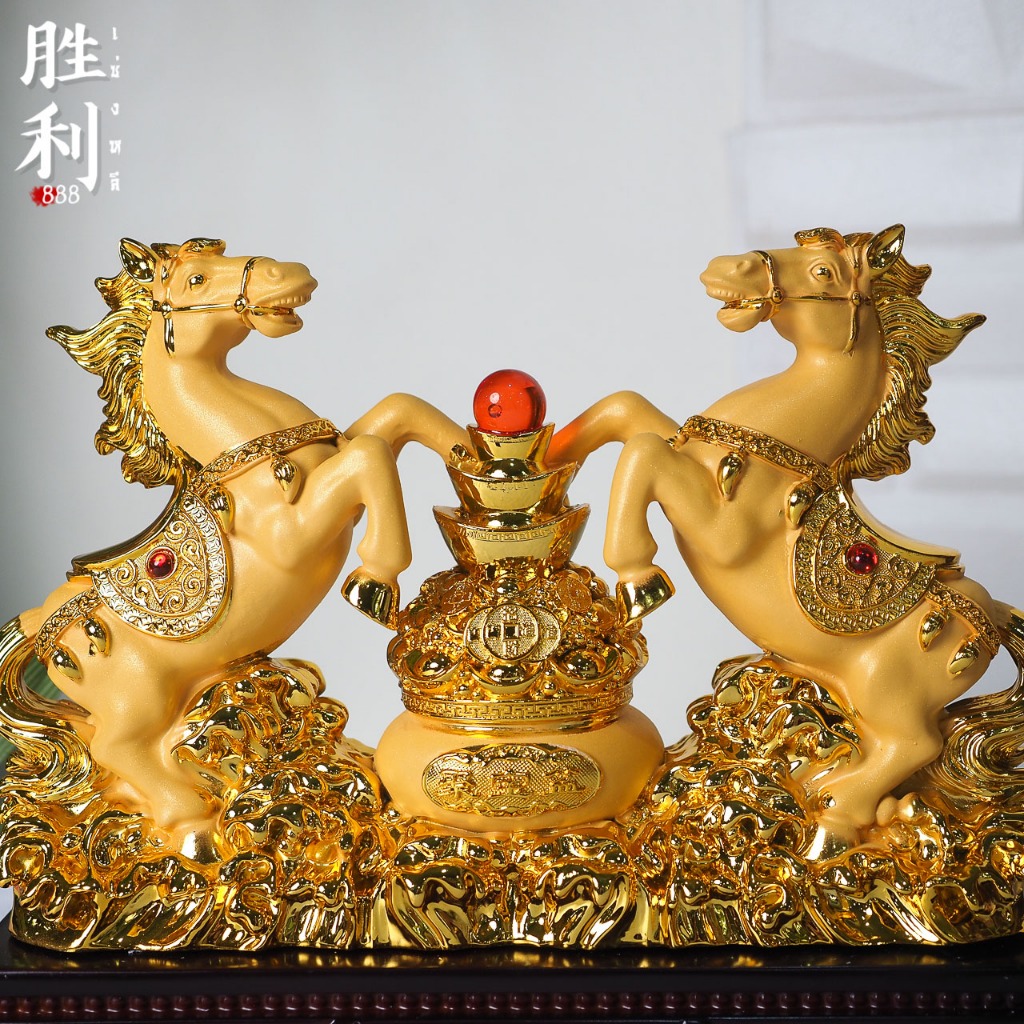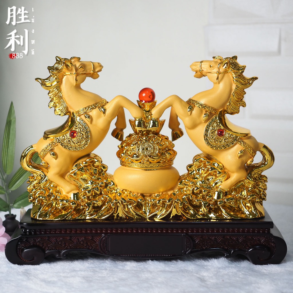 ม้า ม้าทอง ปีมะเมีย 2569 ม้าคู่ ยกขา พร้อมกระถางทองสมบัติ งานเรซิ่นพ่นทรายทอง มีมา 3 ขนาด 9/13/17 นิ้ว