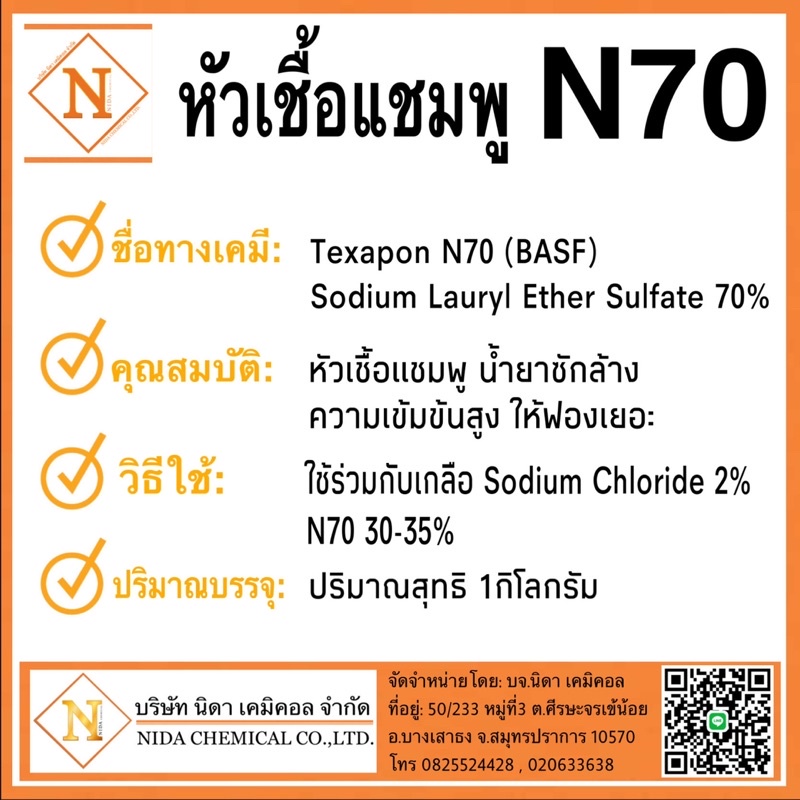 หัวเชื้อแชมพู N70 1กิโล ผลิตโดย:(BASF TH)คุณภ าพสูง เกรดเครื่องสำอางค์