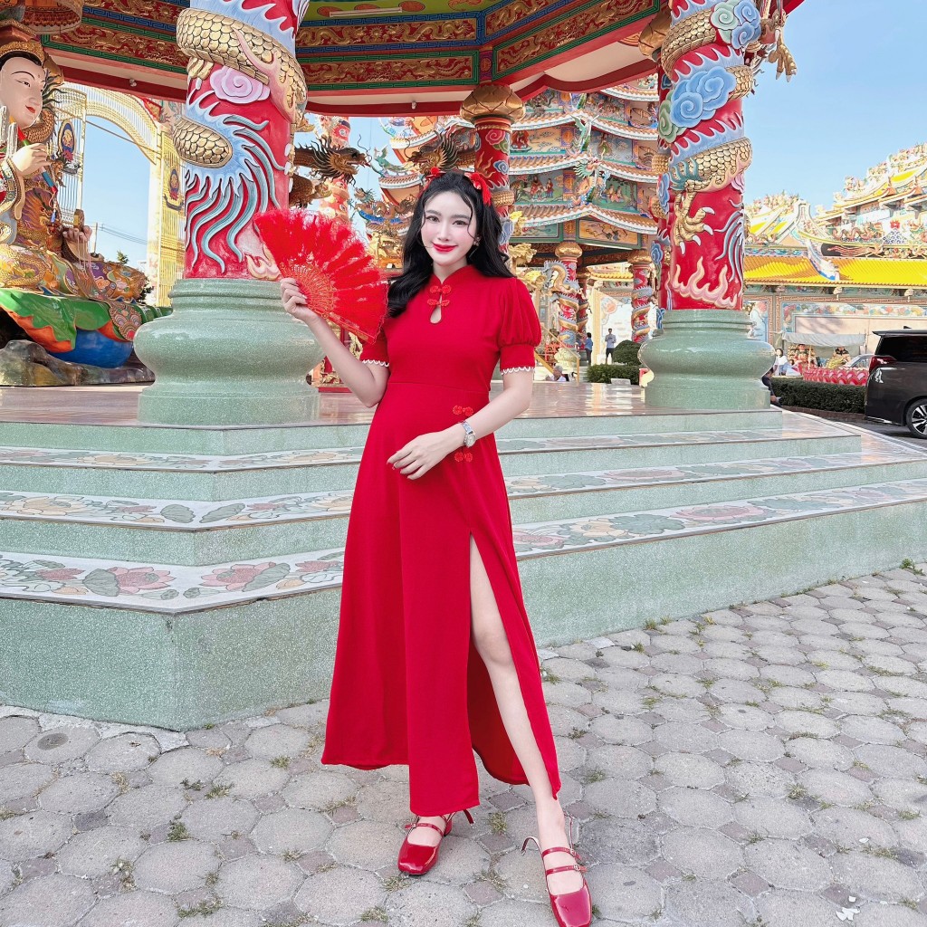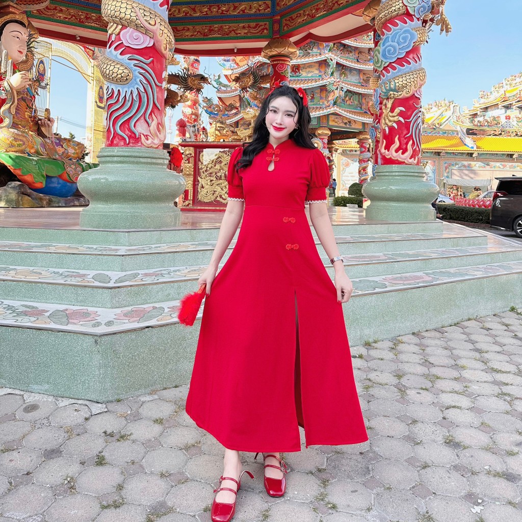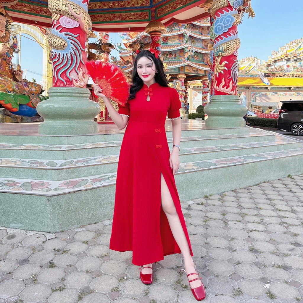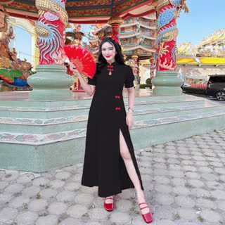 เดรสกี่เพ้าผ้าวูลเวฟอกทรงหยดน้ำผ่าหน้าแต่งกี่เพ้าซิปหลัง A5559