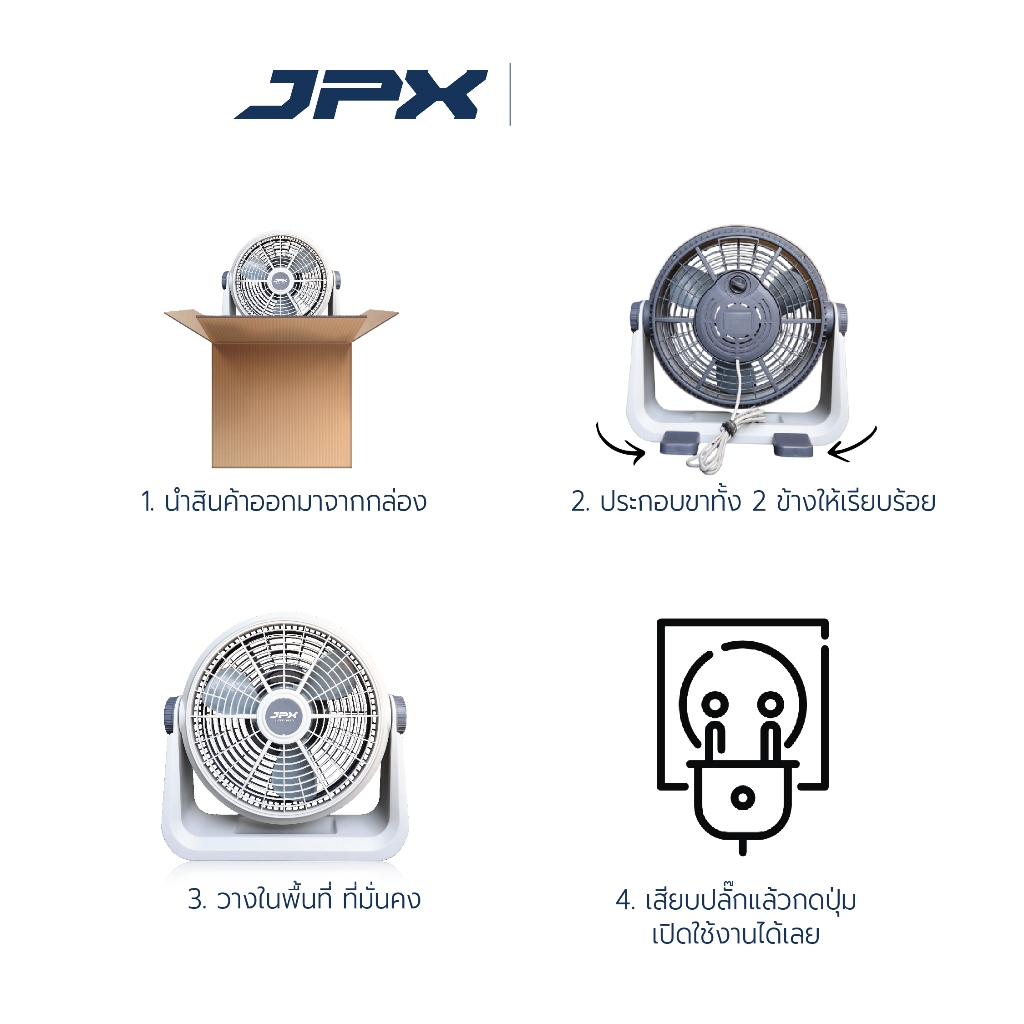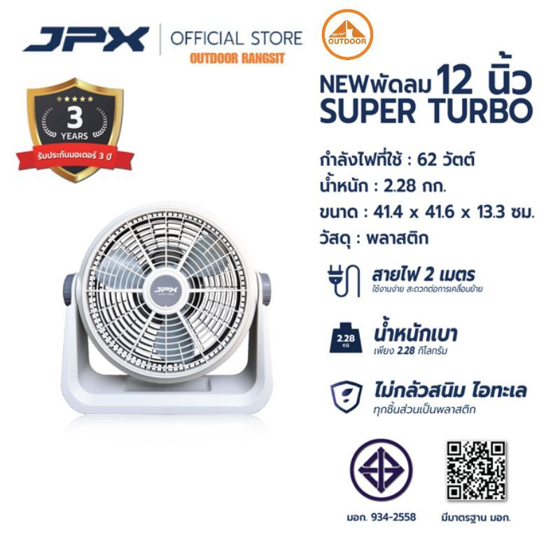 พัดลม JPX Super Turbo 12 นิ้ว #White พัดลมแคมป์ปิ้งขนาด 12 นิ้วแบบเสียบปลั๊ก พกพาสะดวก ใช้งานง่าย