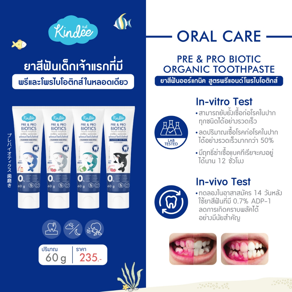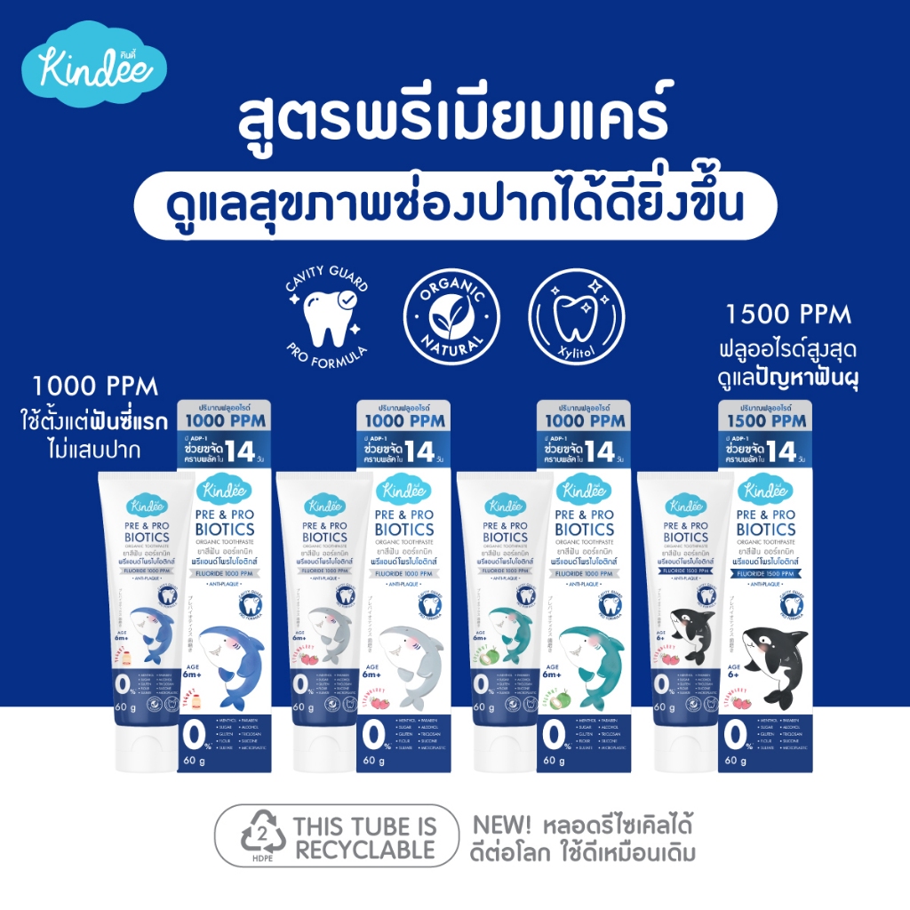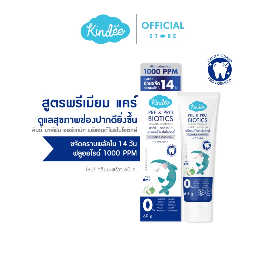 Kindee คินดี้ แปรงสีฟัน ยาสีฟัน ออร์แกนิค สูตรพรีแอนด์โพรไบโอติกส์ มีฟลูออไรด์ (60 กรัม)