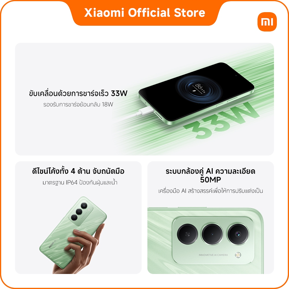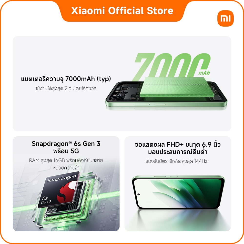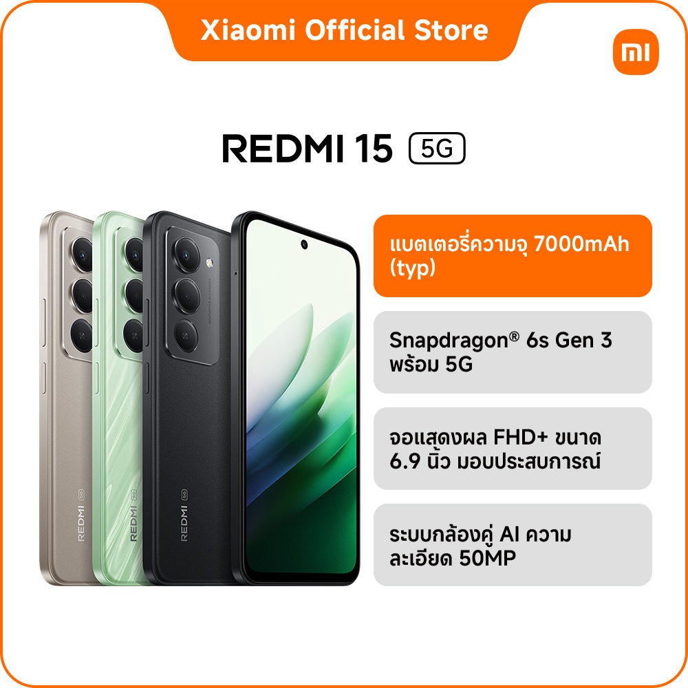 REDMI 15 5G 8+256 แบตเตอรี่ 7000mAh (typ) ชาร์จไว 33W|จอ FHD+ ขนาด 6.9" |ชิปเช็ต Snapdragon® 6s Gen 3 พร้อม 5G