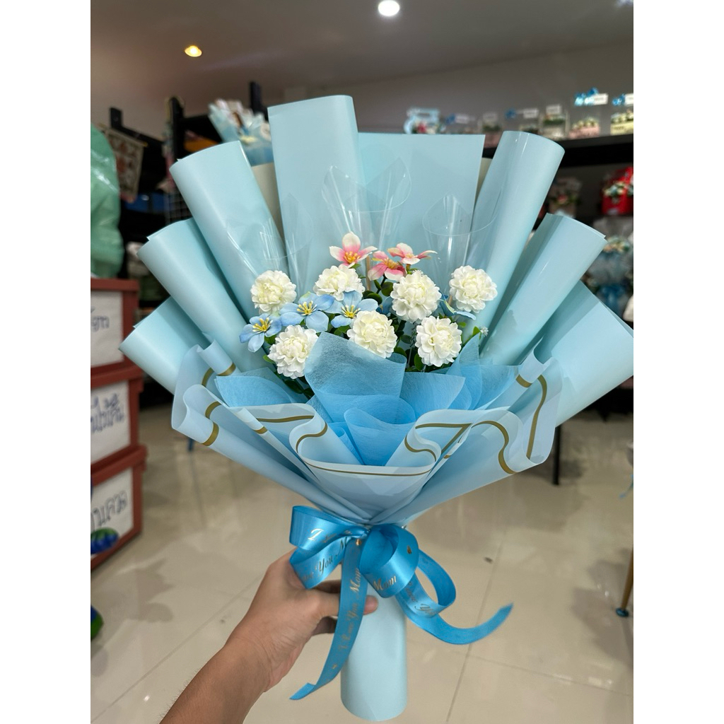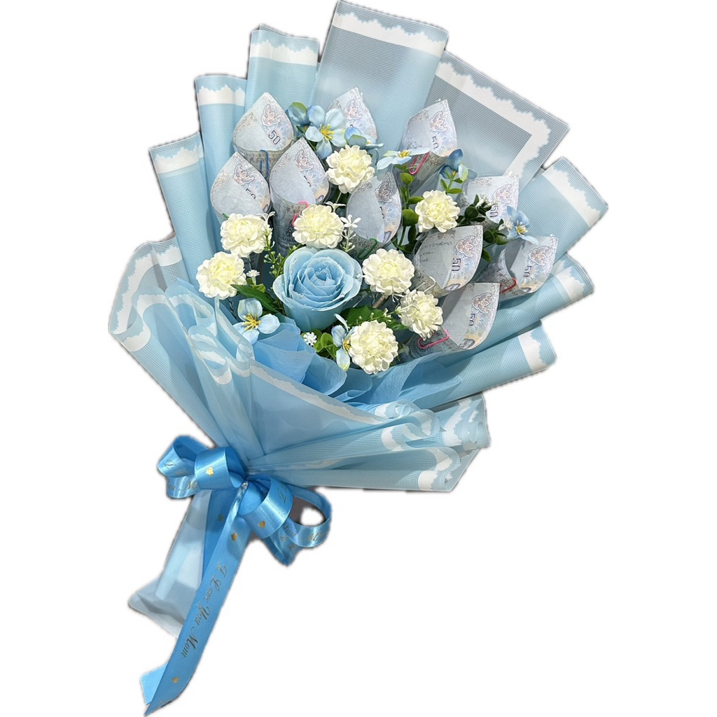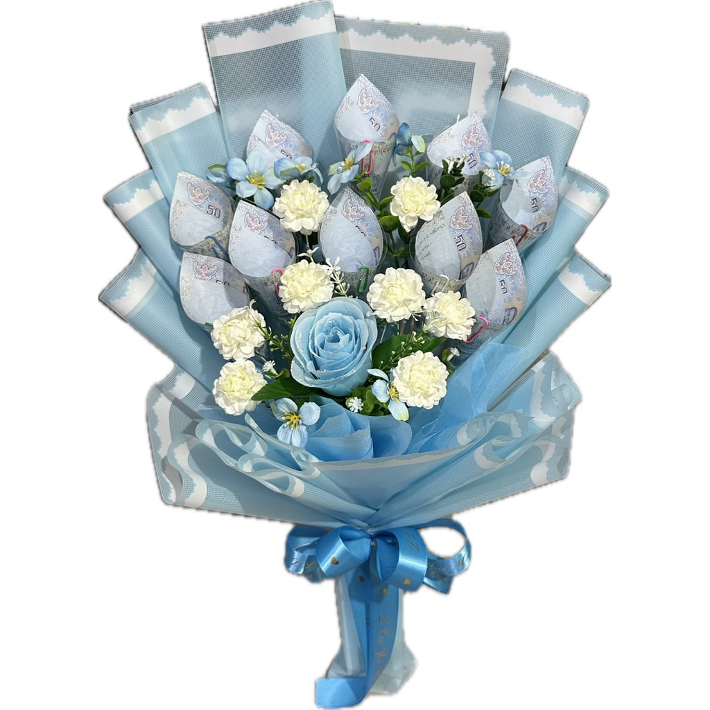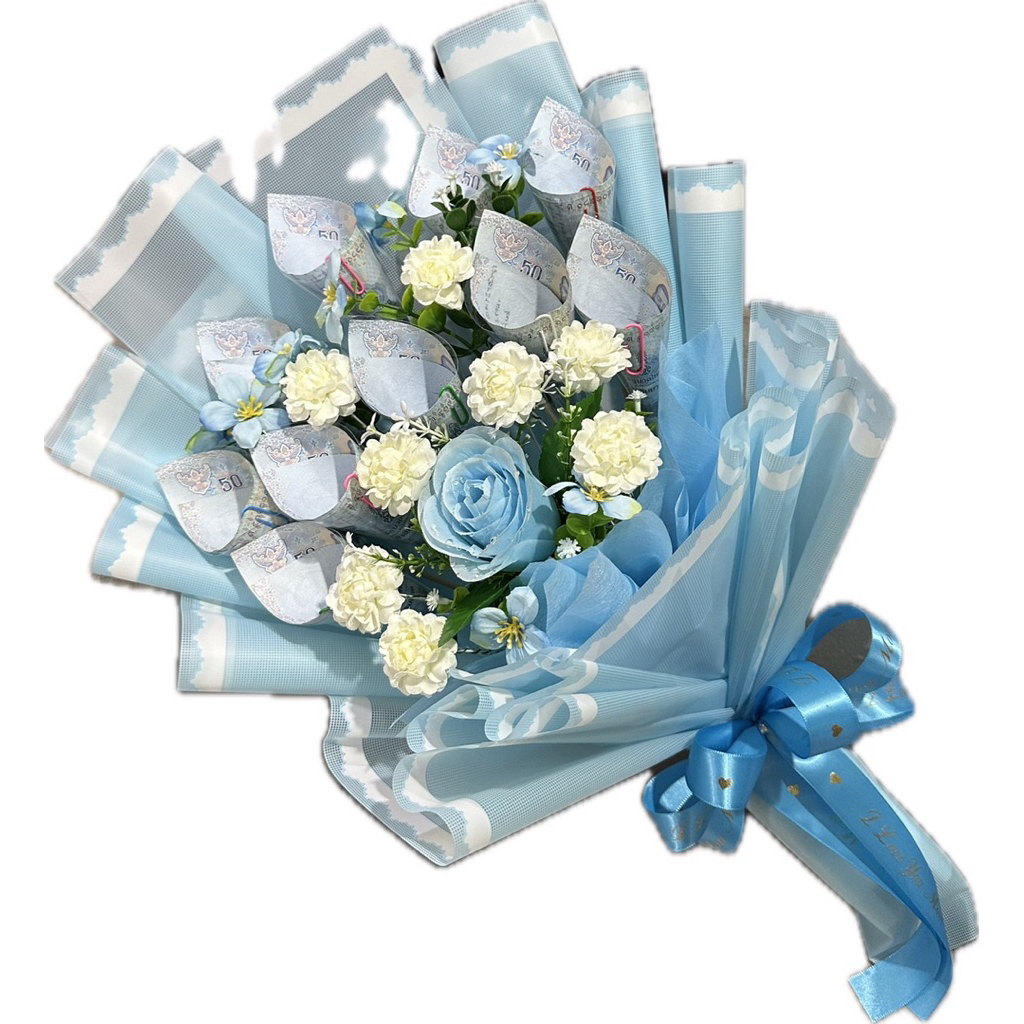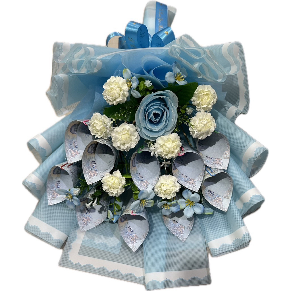 ช่อมะลิวันแม่ ช่อดอกไม้มะลิวันแม่แซมด้วยดอกกุหลาบสีฟ้า(ใส่ธนบัตรได้ 5-10 ใบ)