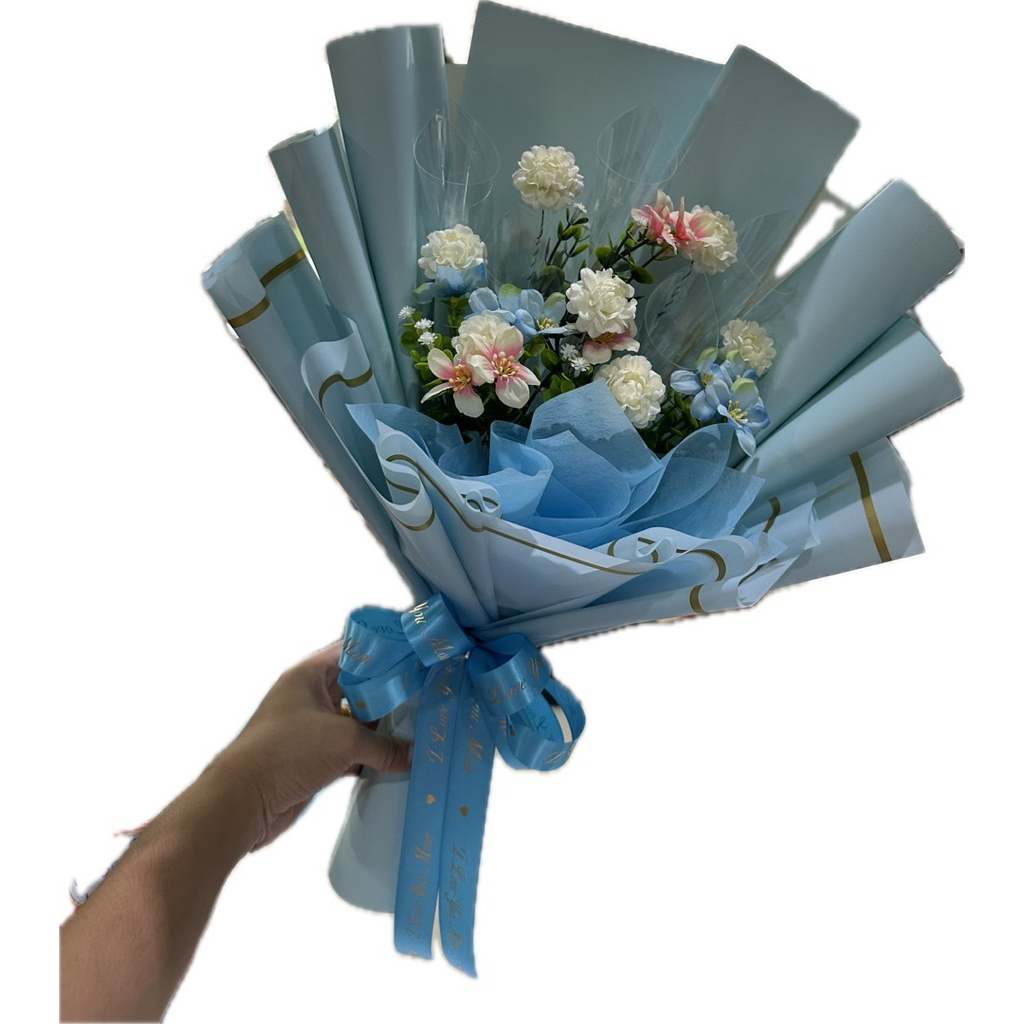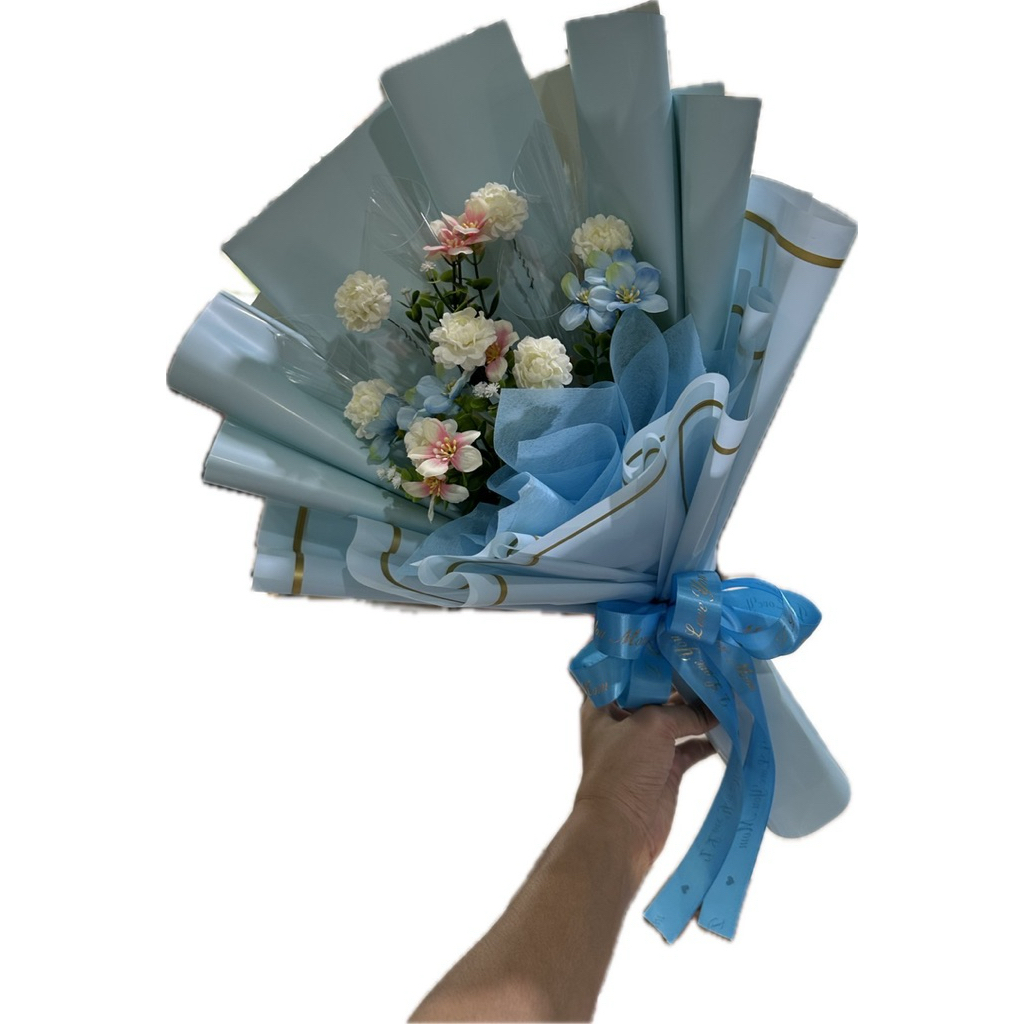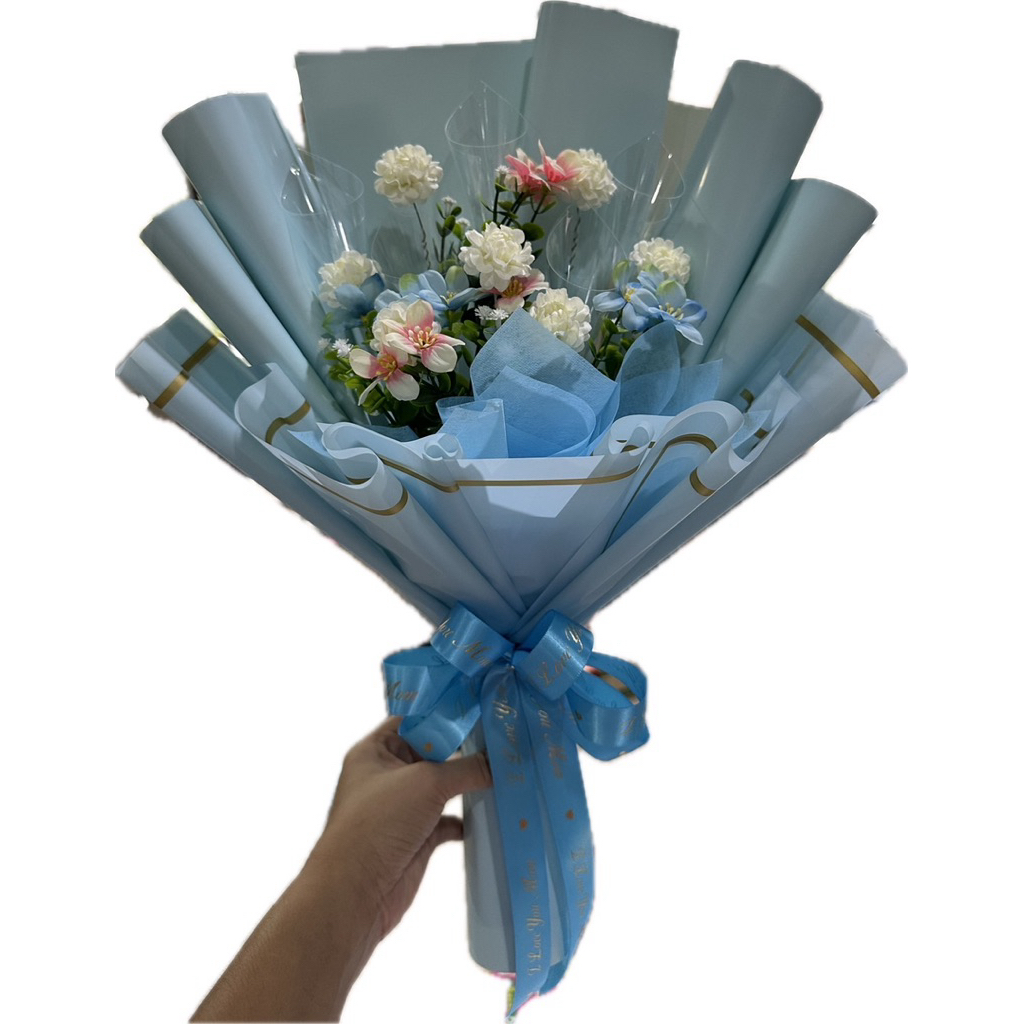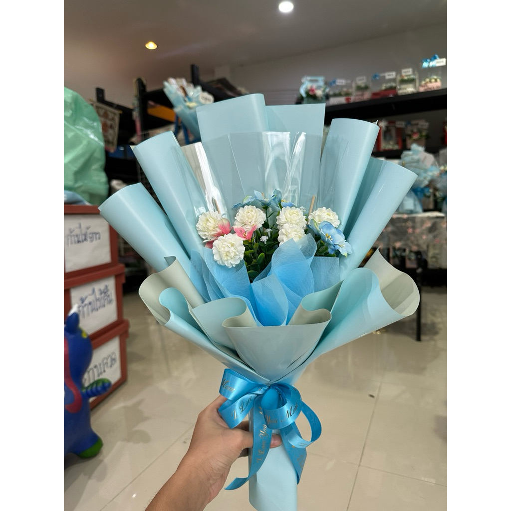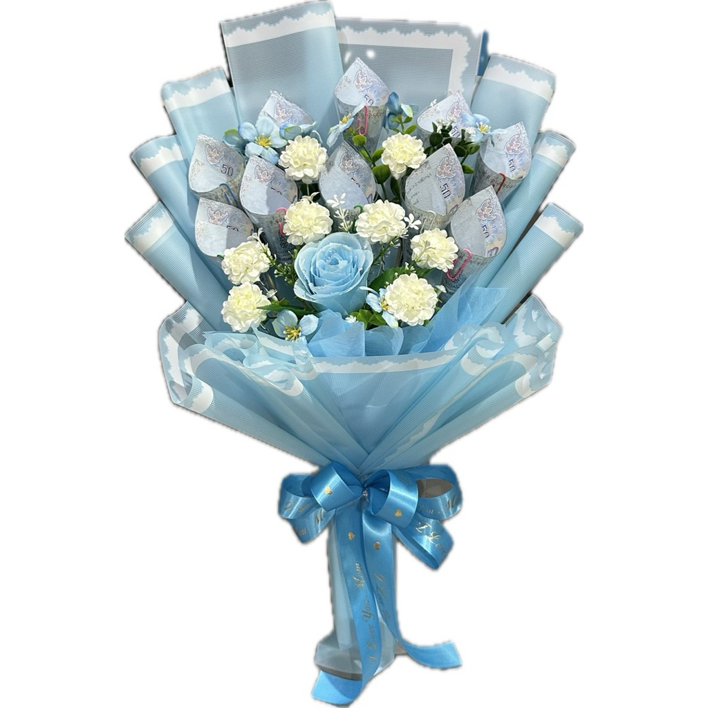 ช่อมะลิวันแม่ ช่อดอกไม้มะลิวันแม่แซมด้วยดอกกุหลาบสีฟ้า(ใส่ธนบัตรได้ 5-10 ใบ)
