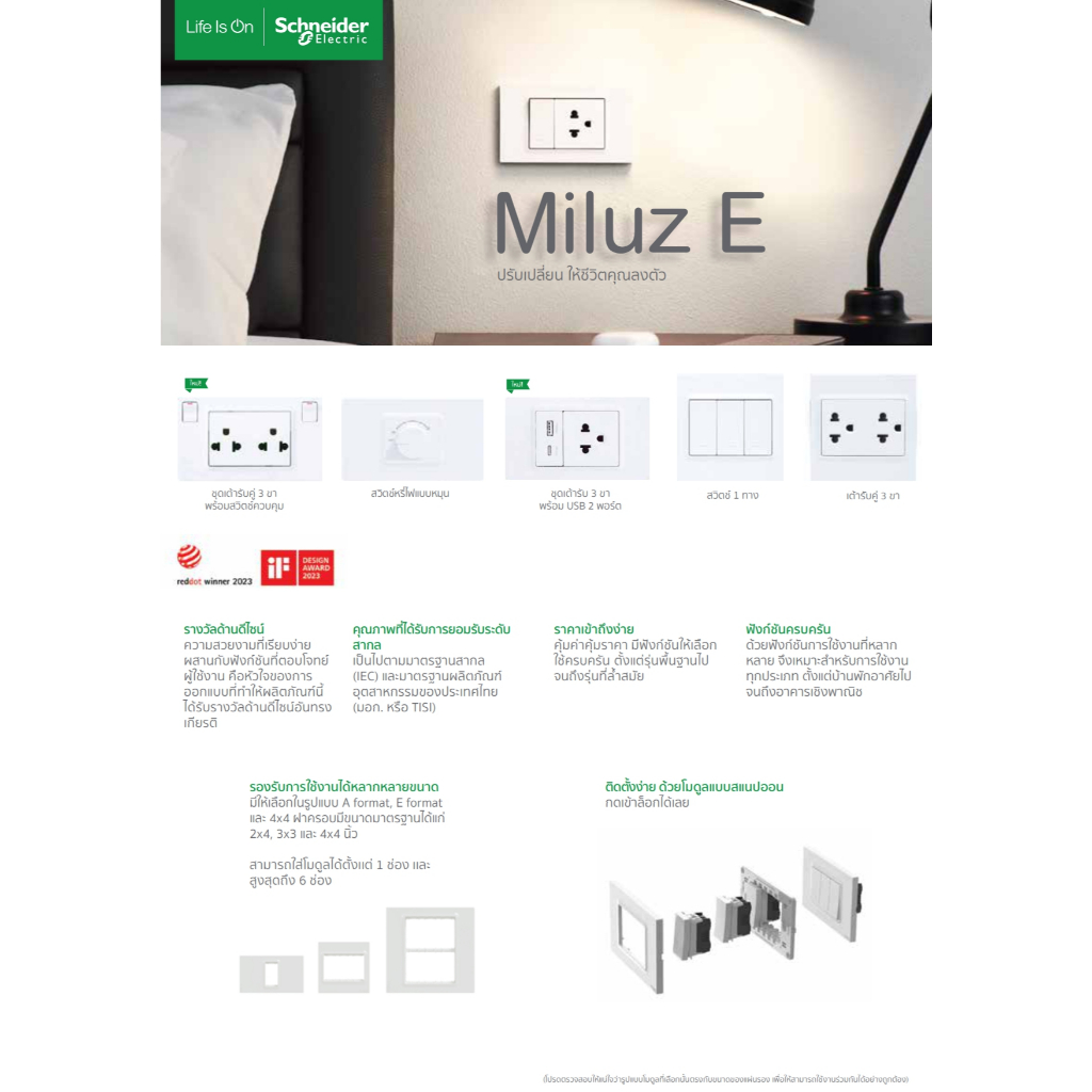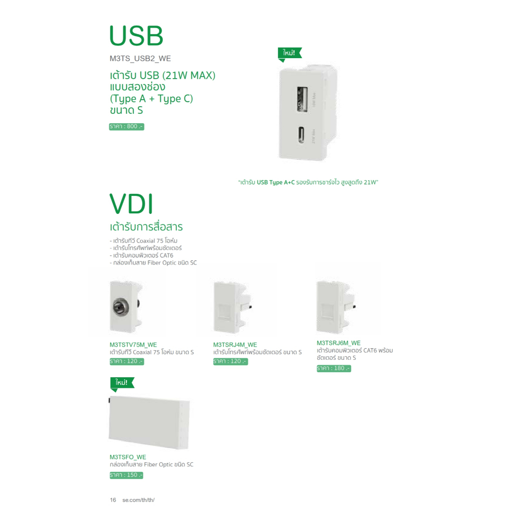 Schneider เต้ารับ USB 2 พอร์ต Miluz E รุ่น M3TS_USB2_WE (Type A+C) 21W ขนาด S