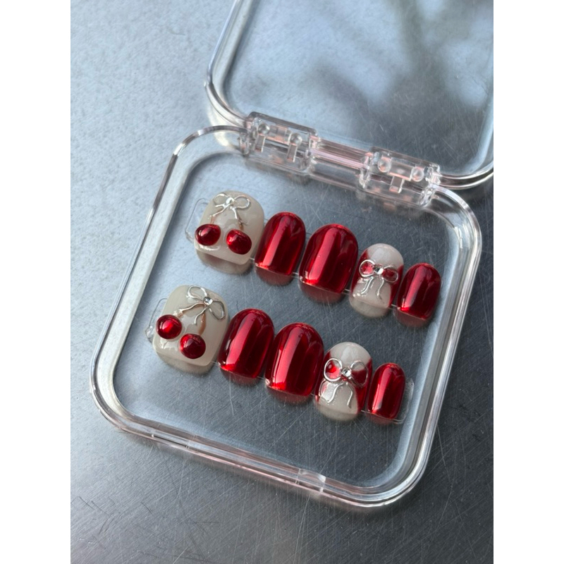 เล็บเจลปลอมสีแดงแรงฤทธิ์เชอร์รี่และโบว์เพิ่มความน่ารักให้กับเล็บ🍒🎀