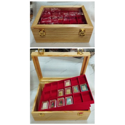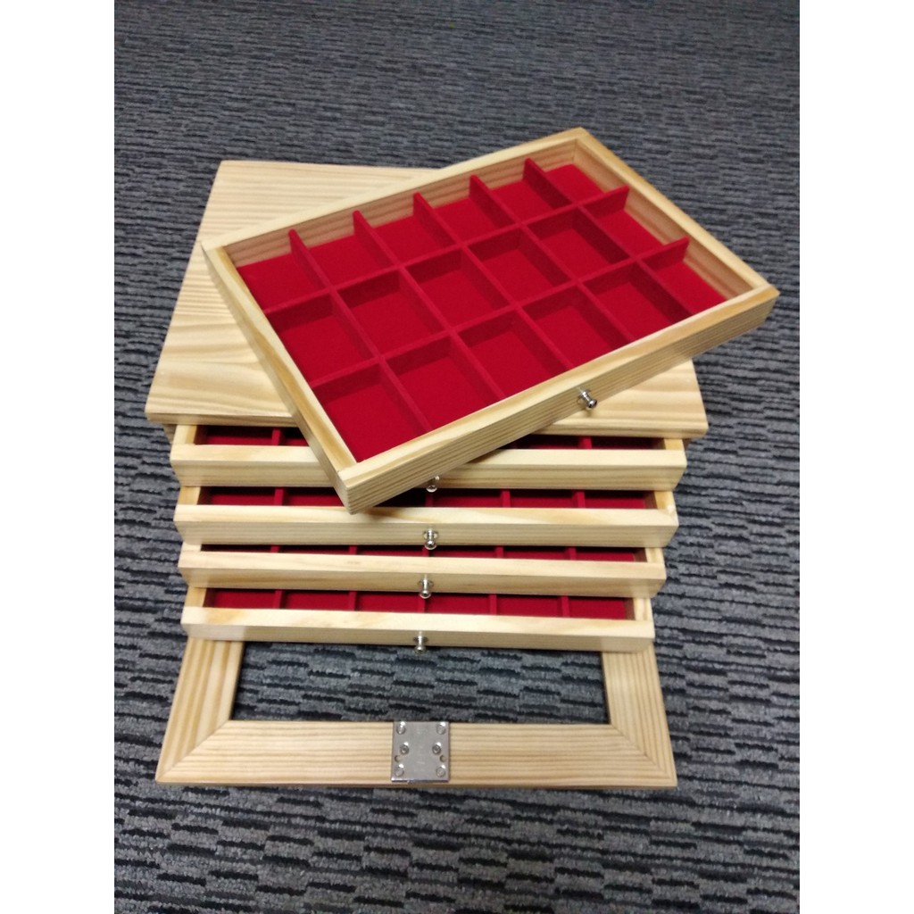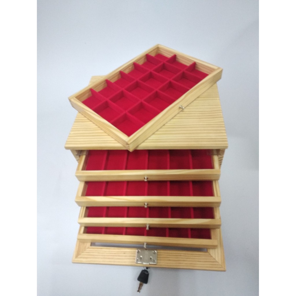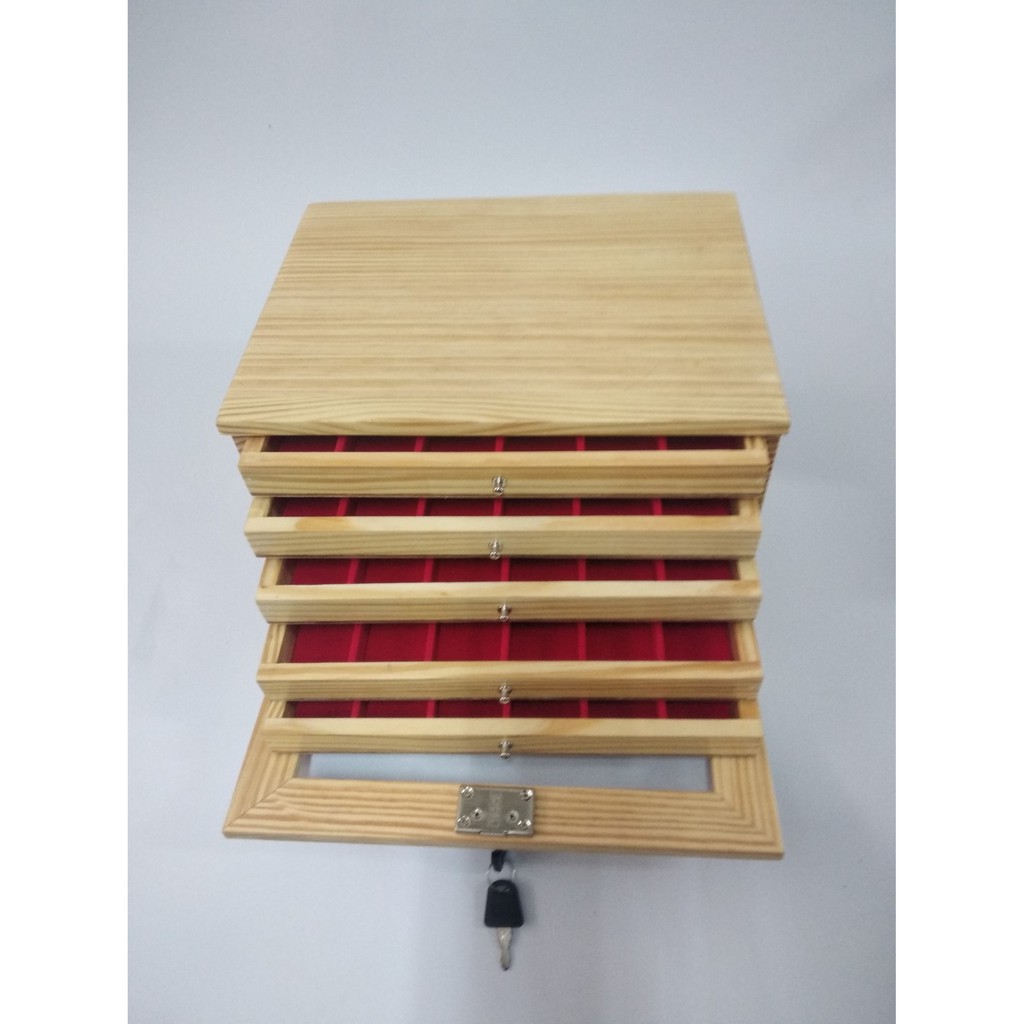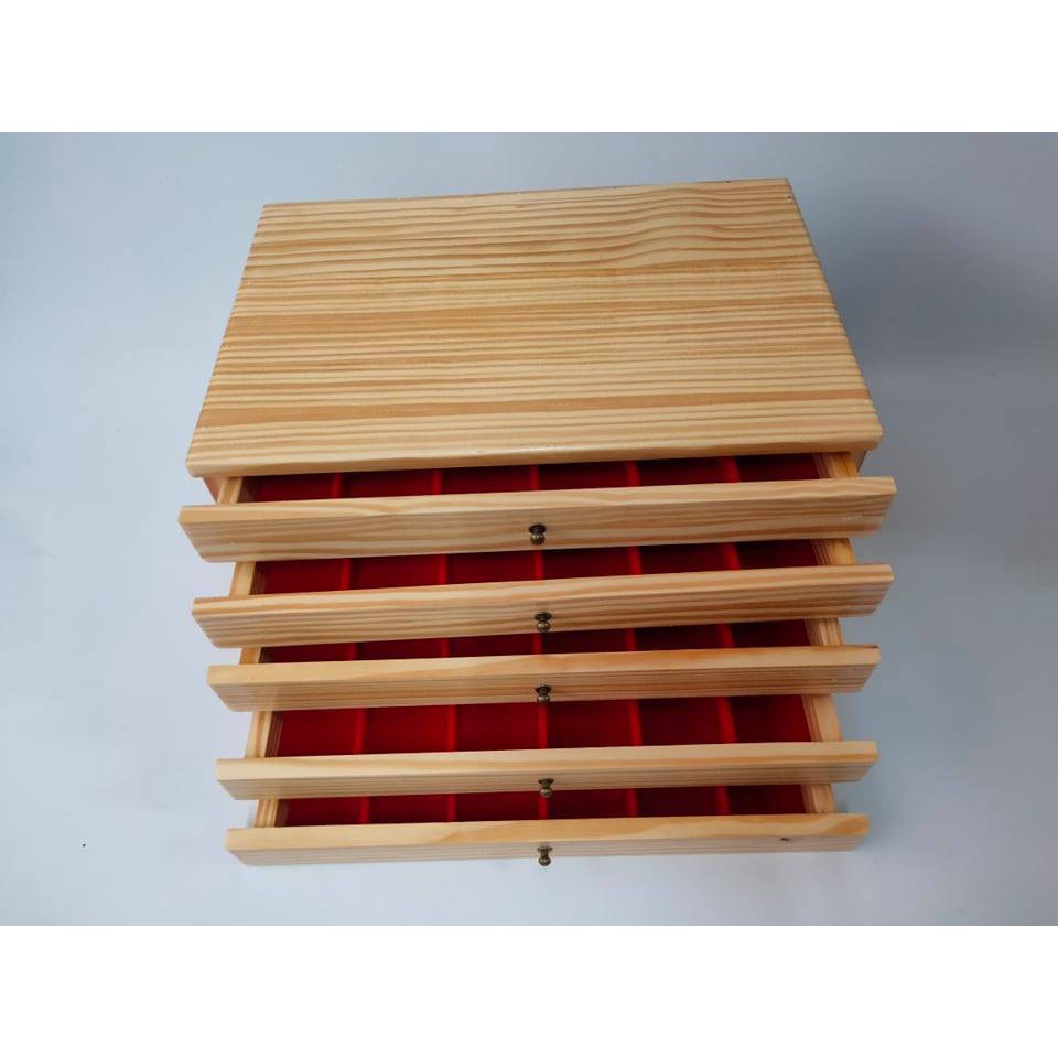 กล่องพระ ตู้ใส่พระ ไม้สน ลิ้นชักไม้สนช่องใหญ่ 4.5*6cm 5 ชั้น 90 ช่อง