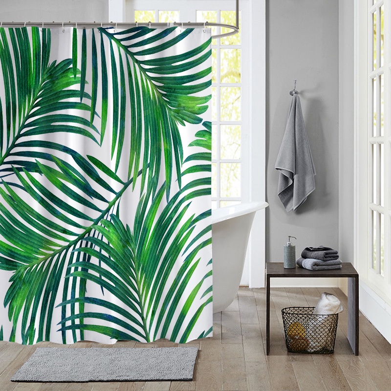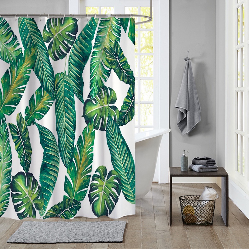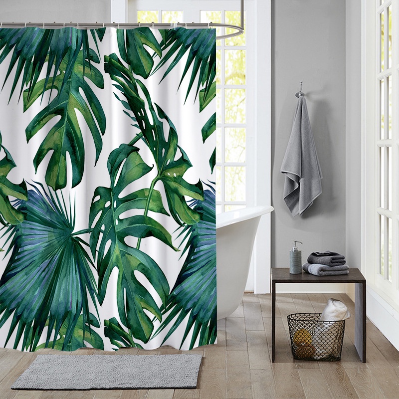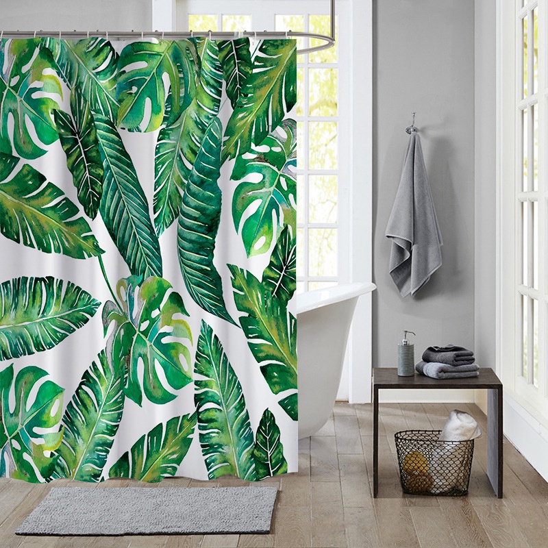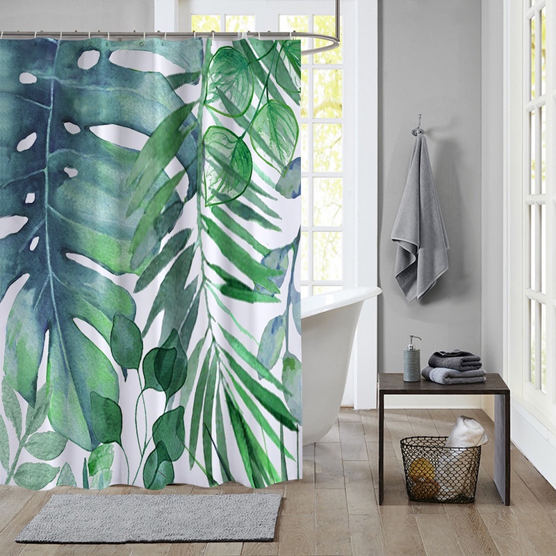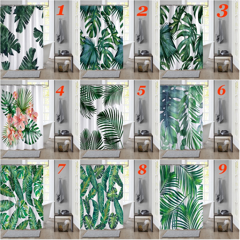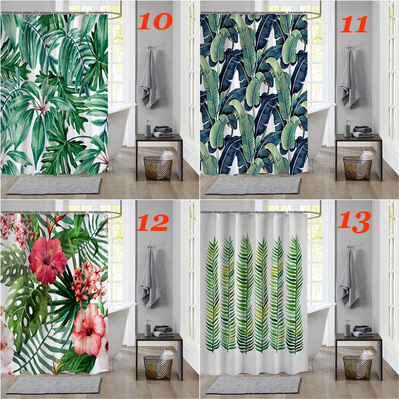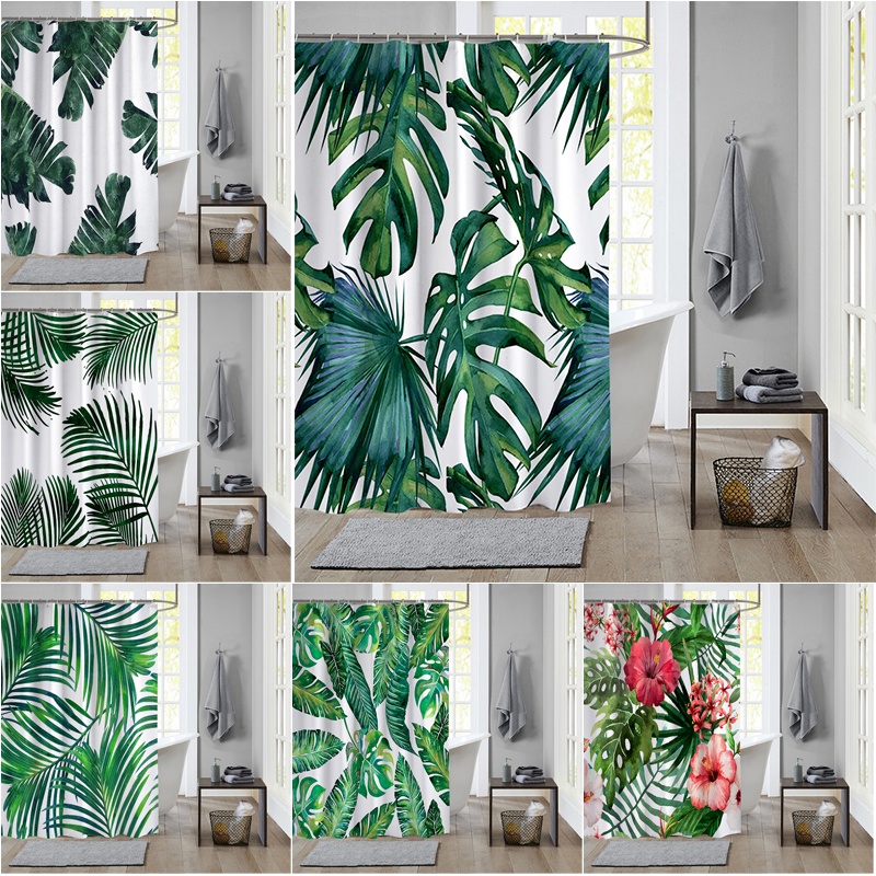 ผ้าม่านโพลีเอสเตอร์ กันน้ํา ลายใบไม้เขตร้อน สีเขียว พร้อมตะขอ 12 ตะขอ สําหรับตกแต่งห้องน้ํา