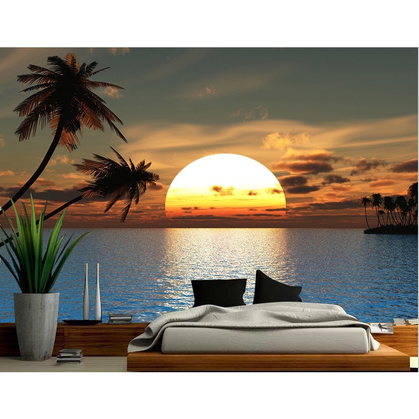 Custom 3D วอลล์เปเปอร์ Tropical Sunset Ocean Palm Tree ภาพจิตรกรรมฝาผนังผนัง, ที่ถอดออกได้ตกแต่ง Self-กาว PVC สติ๊กเกอร์ติดผนัง