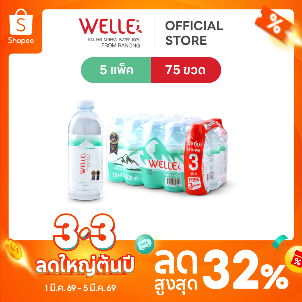 New (60 ขวดฟรี 15 ขวด) Welle Mineral Water น้ำแร่เวลล์เล่ 500 มิลลิลิตร 5 แพค จากแหล่งน้ำแร่ระนอง
