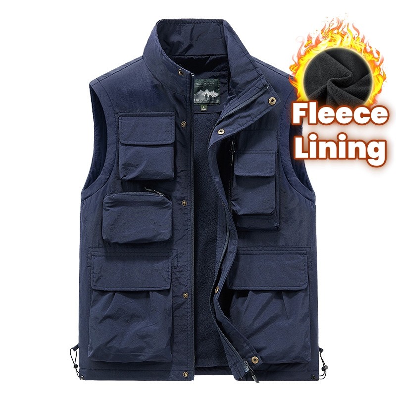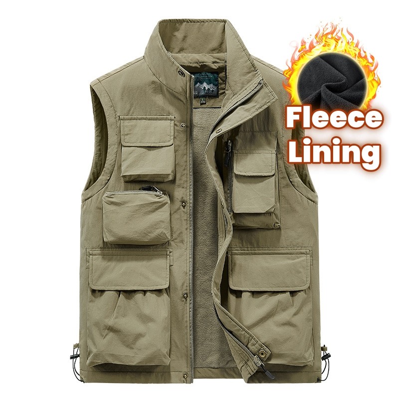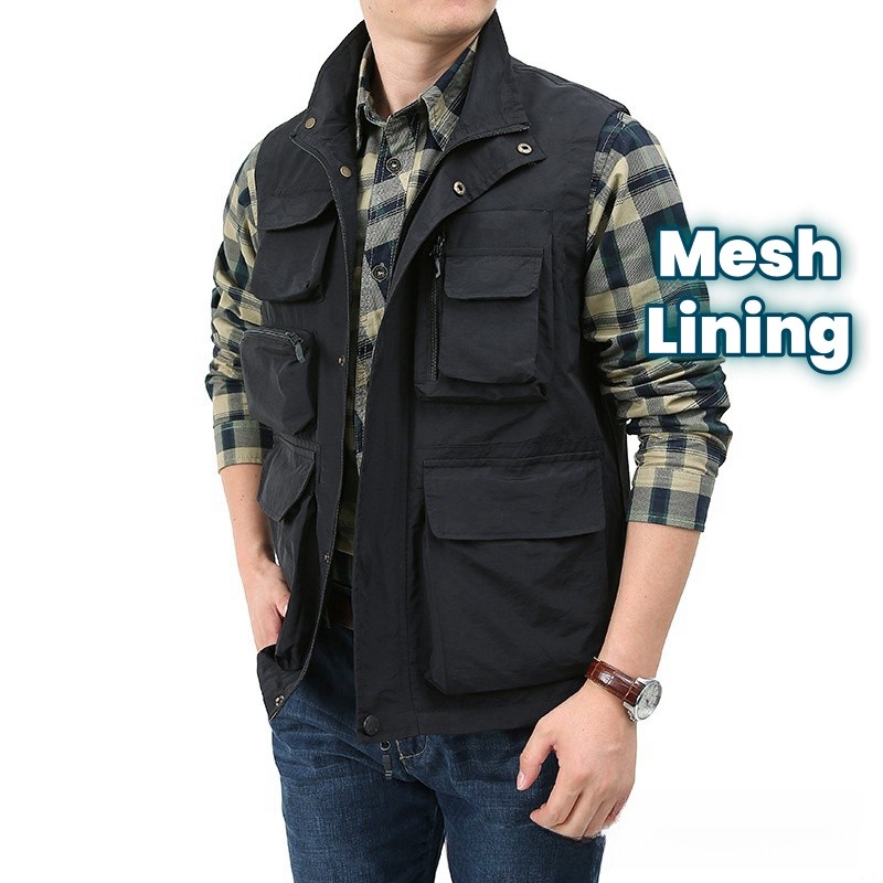 ผู้ชายซาฟารีตกปลายิงเสื้อกั๊กกลางแจ้งตาข่ายทํางานนักข่าวเสื้อกั๊กแจ็คเก็ตระบายอากาศแห้งเร็วแขนกุดแจ็คเก็ตสินค้าที่มี8กระเป๋าขนแกะเรียงรายเสื้อกั