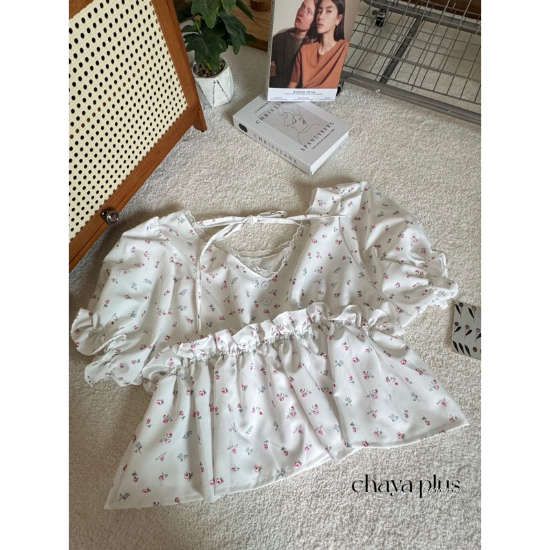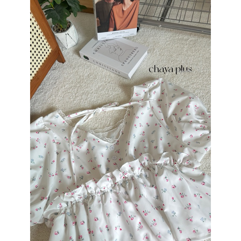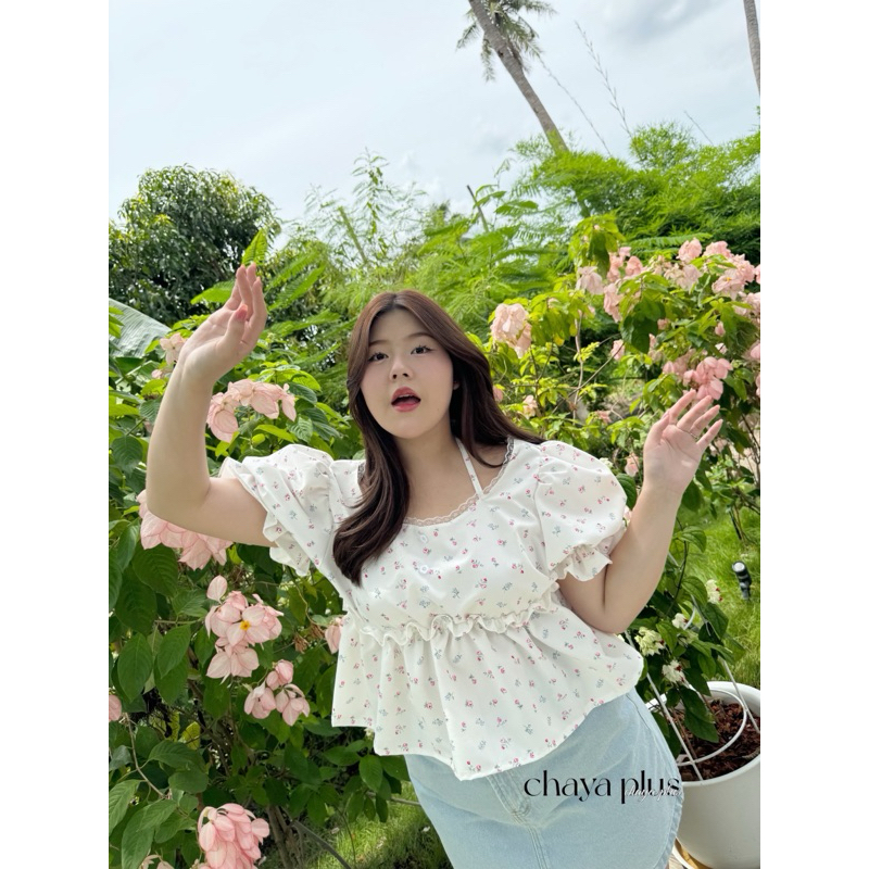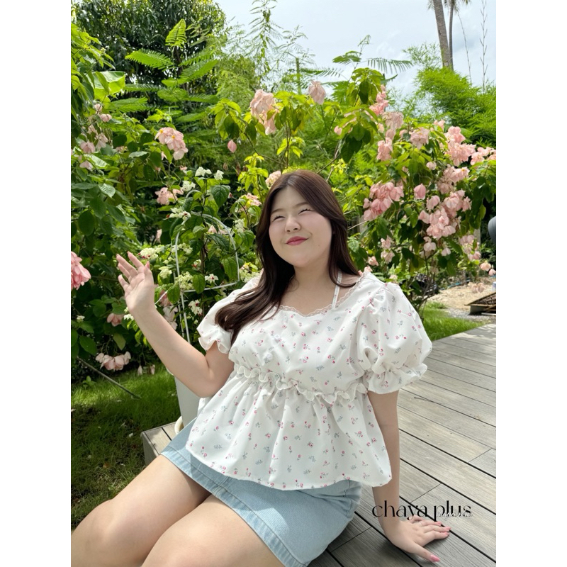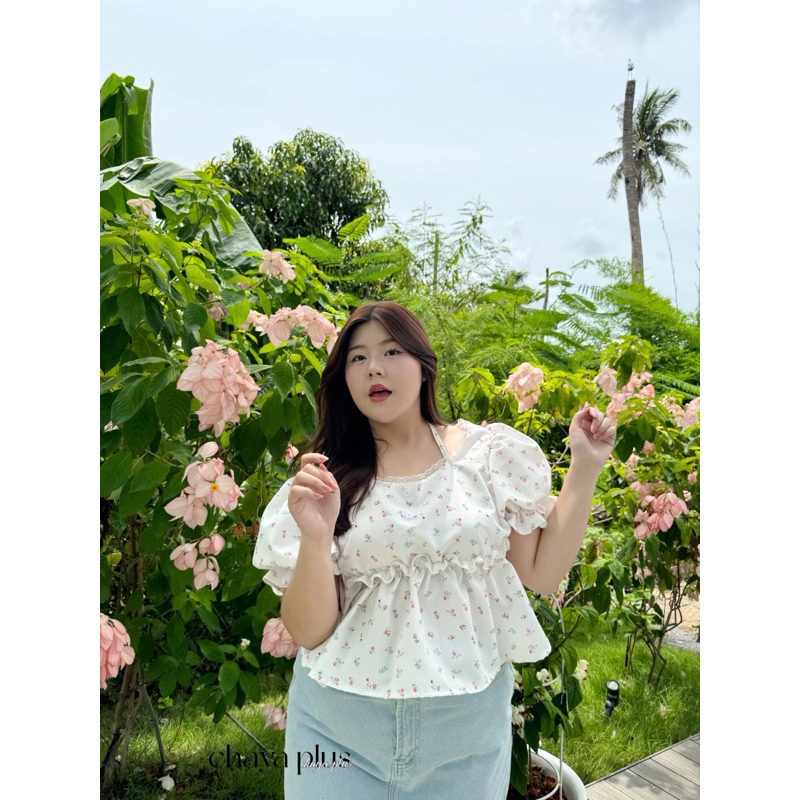 (LD) เสื้อแขนตุ๊กตา ลายดอกไม้ ดีเทลคล้องคอ สุดน่ารัก หวาน ละมุนมากๆ เสื้อผ้าสาวอวบอ้วน พลัสไซส์ ไซส์ใหญ่