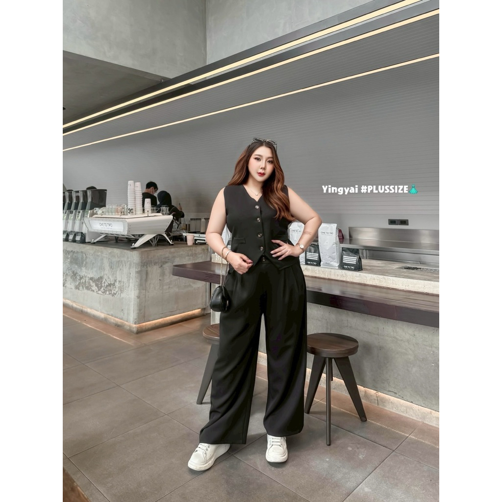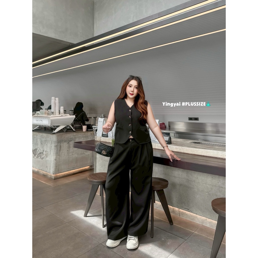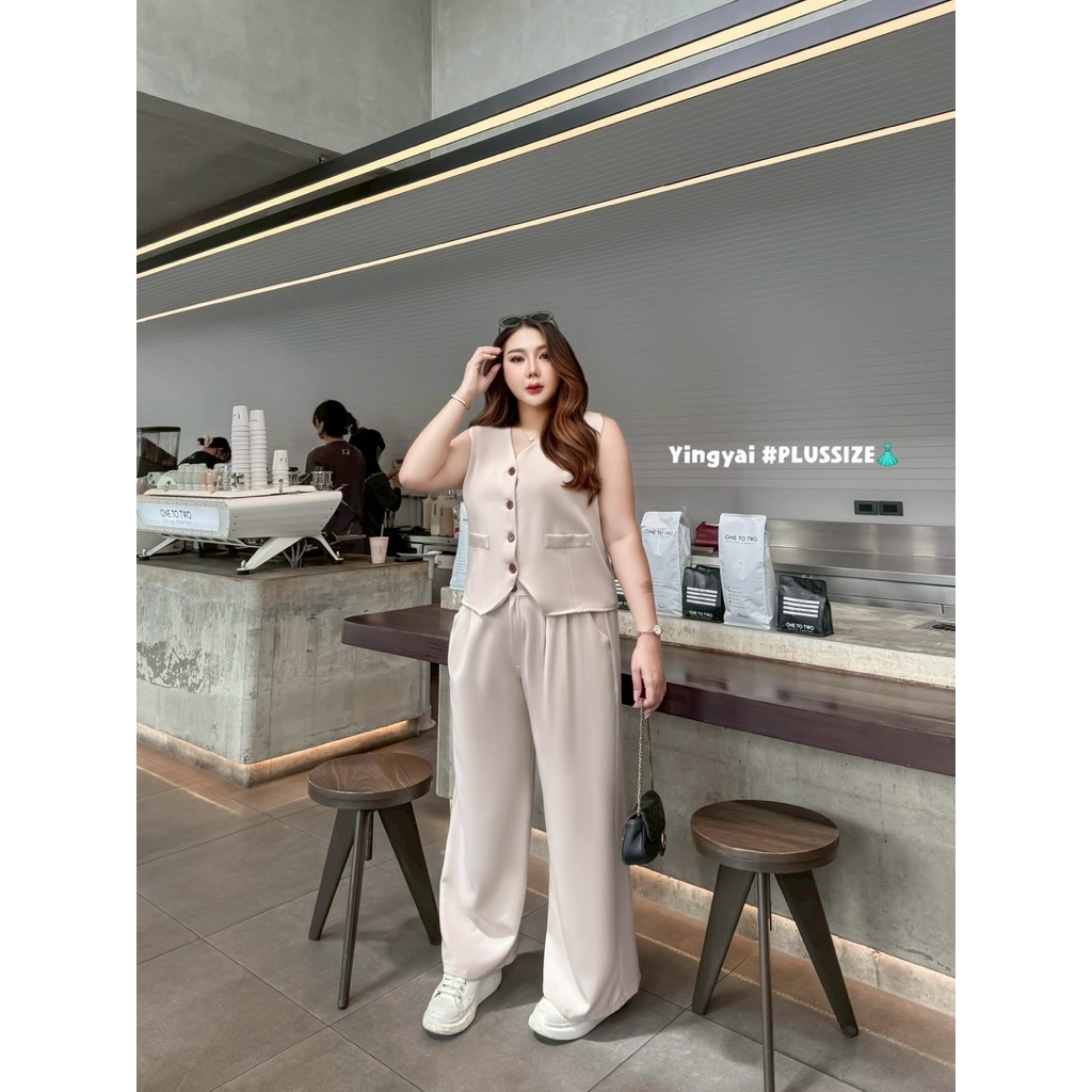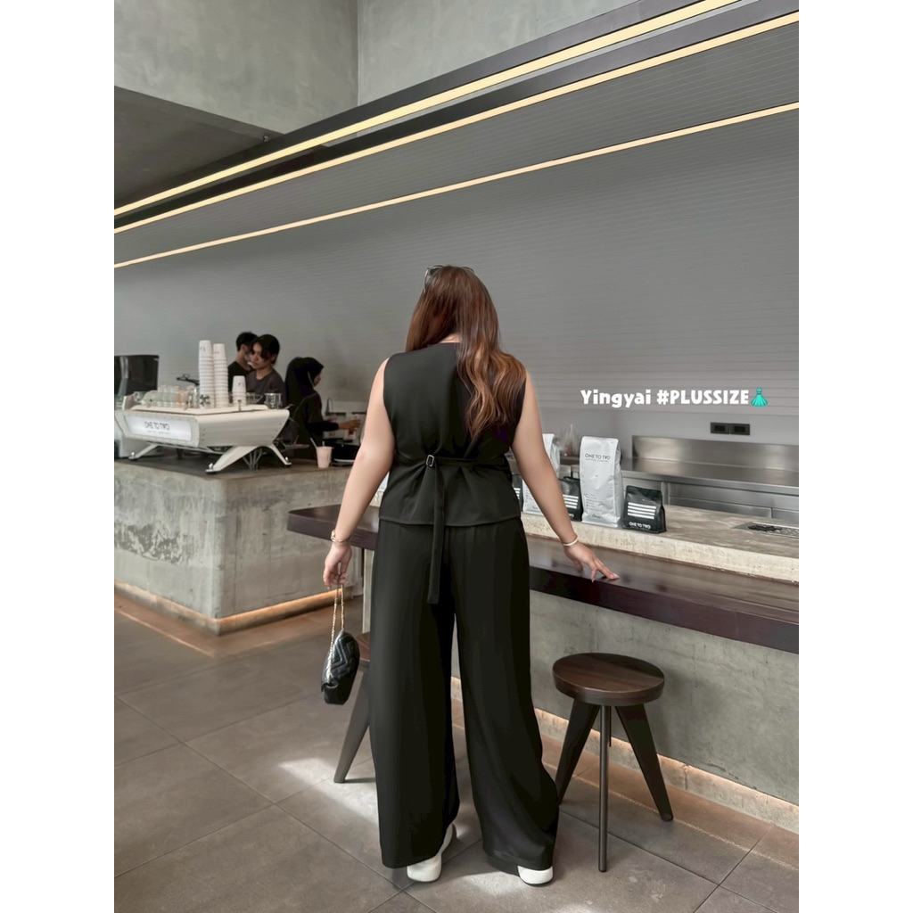 (YY) SETเสื้อกั๊กสูทกระดุมหน้า ด้านหลังปรับเลื่อนได้ มาพร้อมกางเกงขายาว มีซิป มีพระดุม เอวสม็อคหลังยืดได้ตามตัว ไซส์ใหญ่