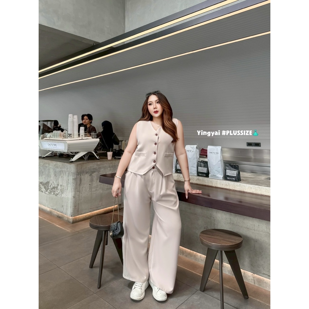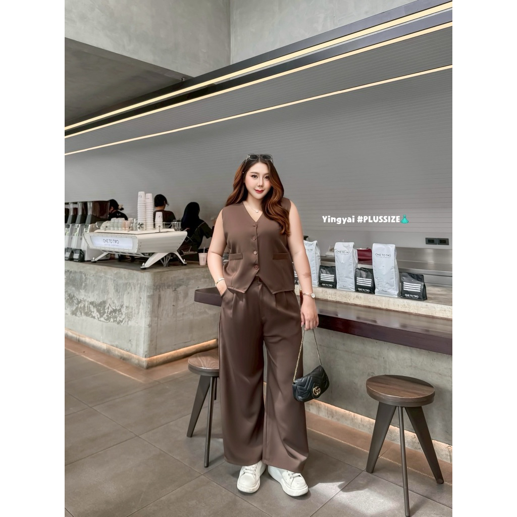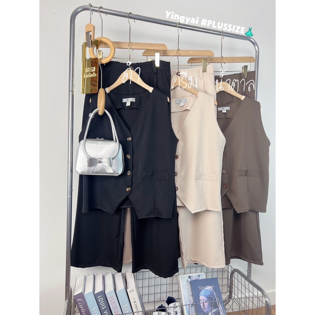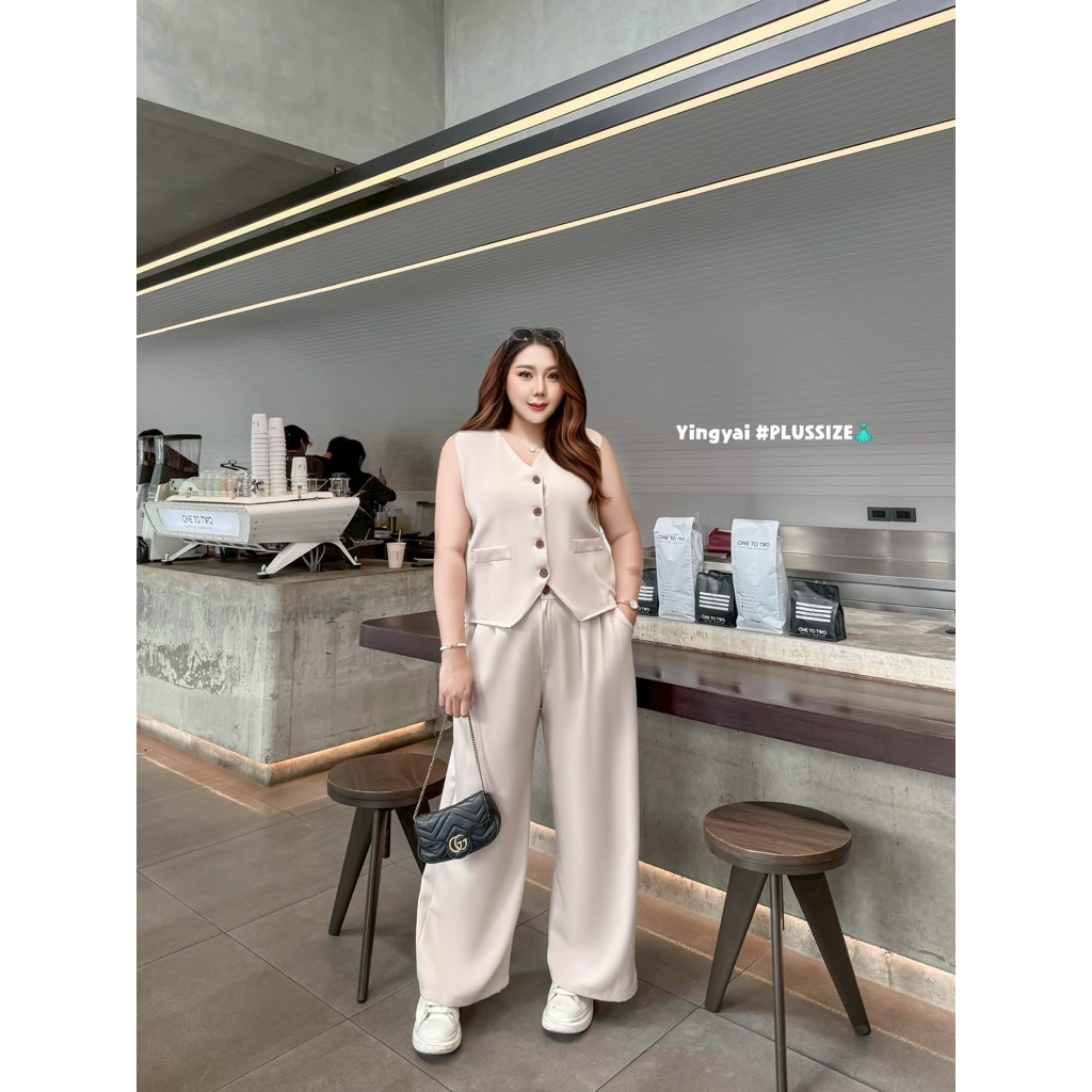 (YY) SETเสื้อกั๊กสูทกระดุมหน้า ด้านหลังปรับเลื่อนได้ มาพร้อมกางเกงขายาว มีซิป มีพระดุม เอวสม็อคหลังยืดได้ตามตัว ไซส์ใหญ่