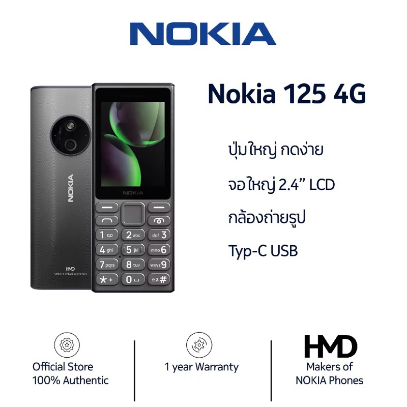 Nokia 125 4G (2024) โทรศัพท์มือถือปุ่มกด 2 ซิม พร้อมวิทยุ FM ก้นชาร์จ Type-C (ประกันศูนย์ไทย 1 ปี)