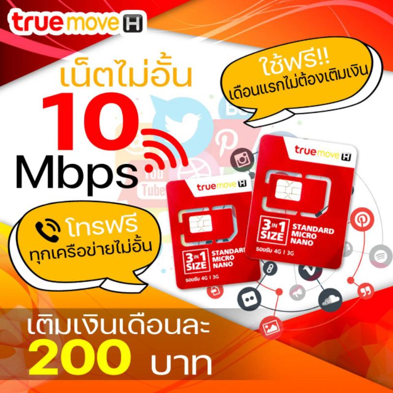 ซิมเน็ตทรูไม่อั้นไม่ลดสปรีด ซิมโทรฟรีทุกเครือข่าย เน็ต 10 Mbps เดือนละ 200 บาท
