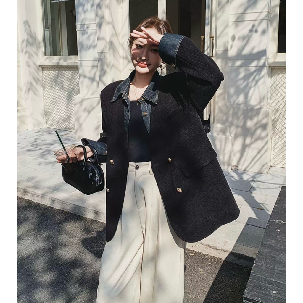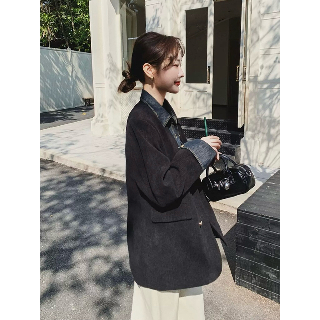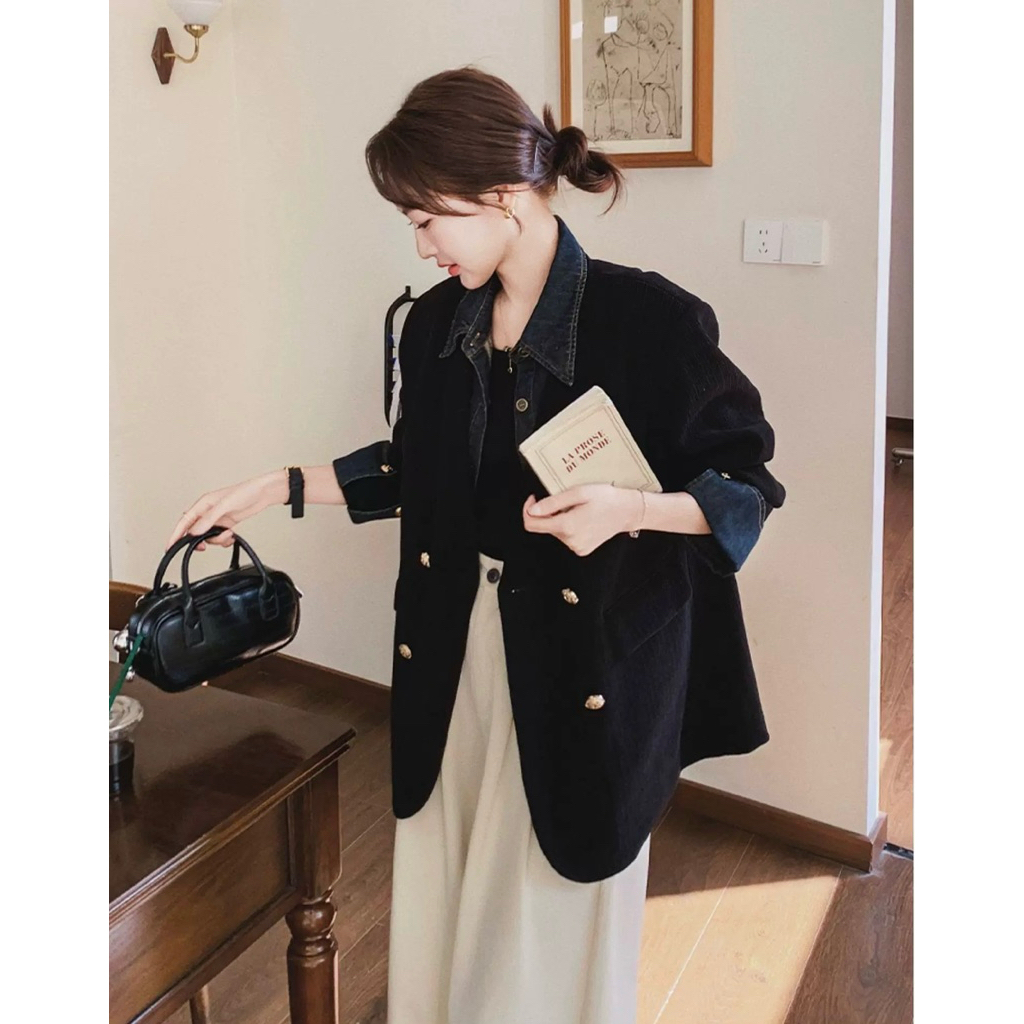 E54 สูทเบเซอแต่งแถบยีนส์ ผ้าริบลูกฟูก งานสุดเก๋ พร้อมส่ง