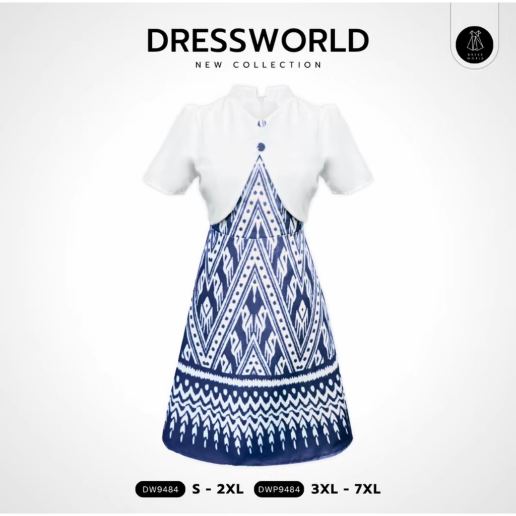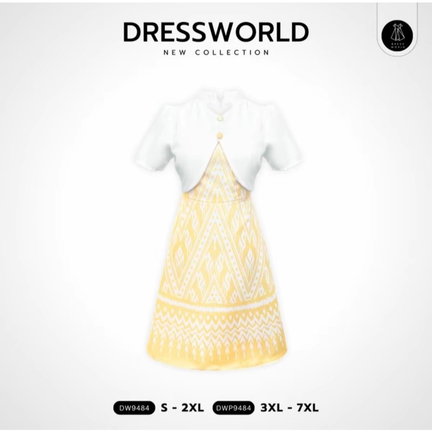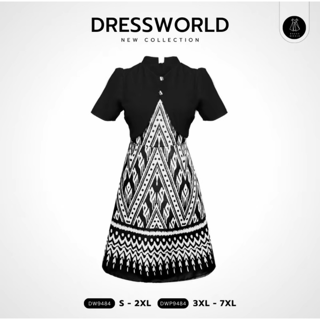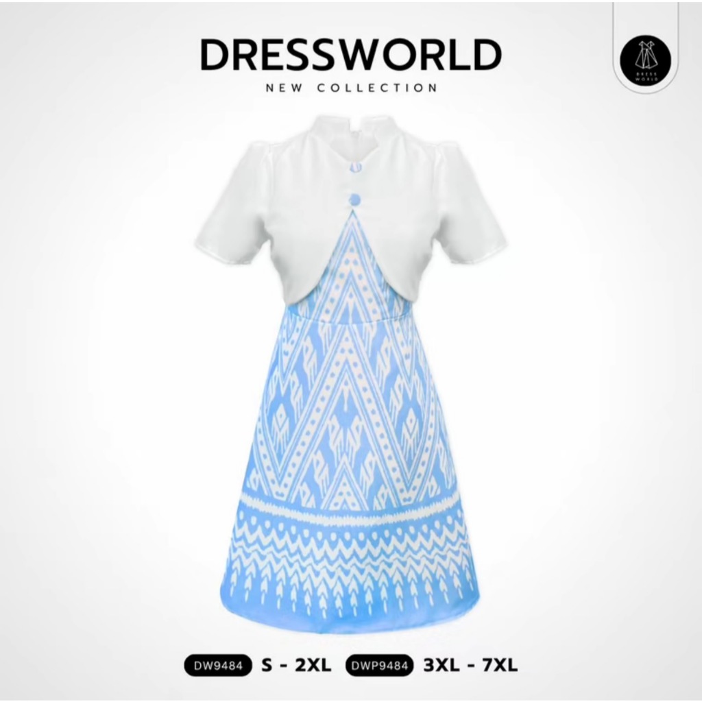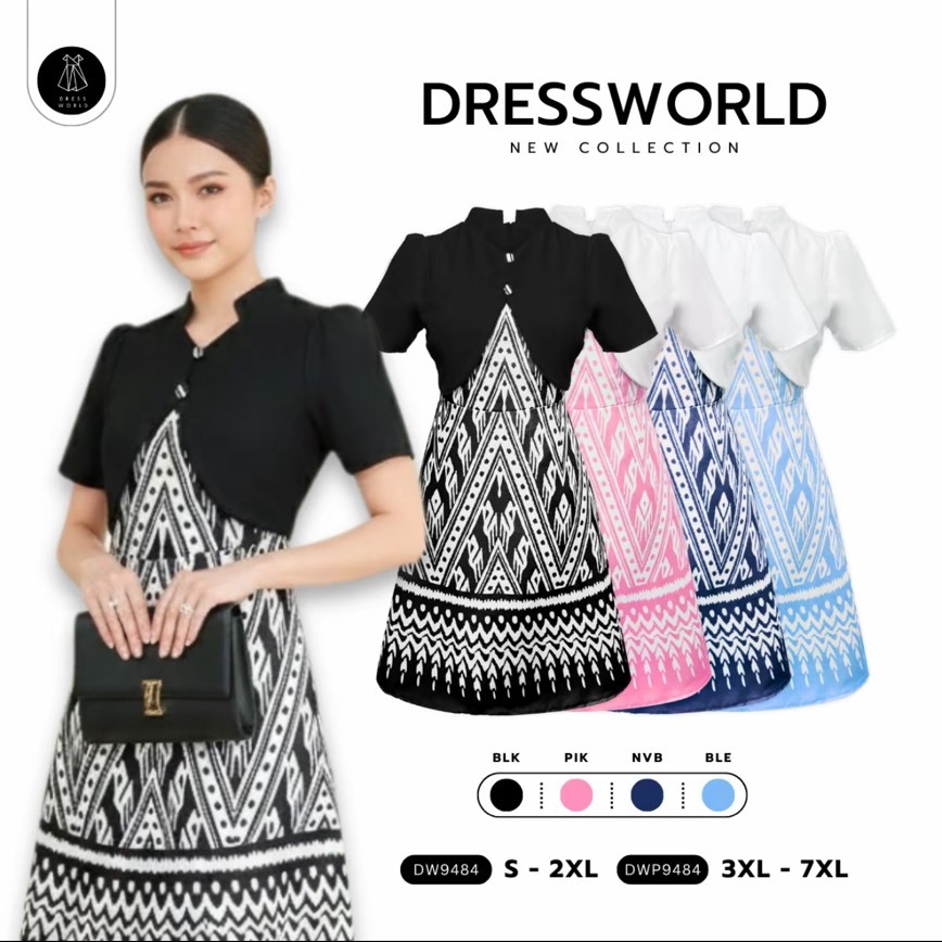 {S-7XL} 9484 งานป้าย Dress World เดรสสั้นทรงบาน คอจีน ช่วงล่างลายไทย เดรสทำงาน