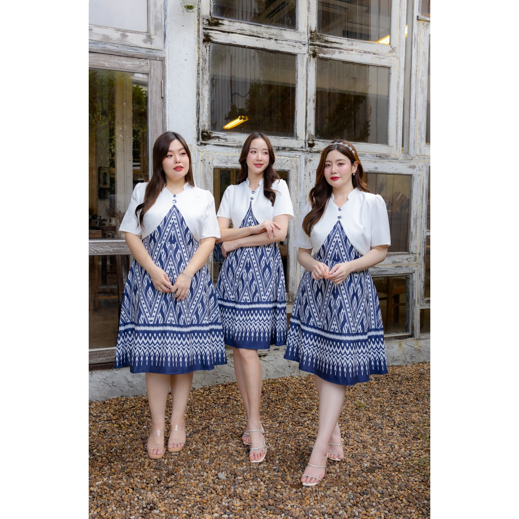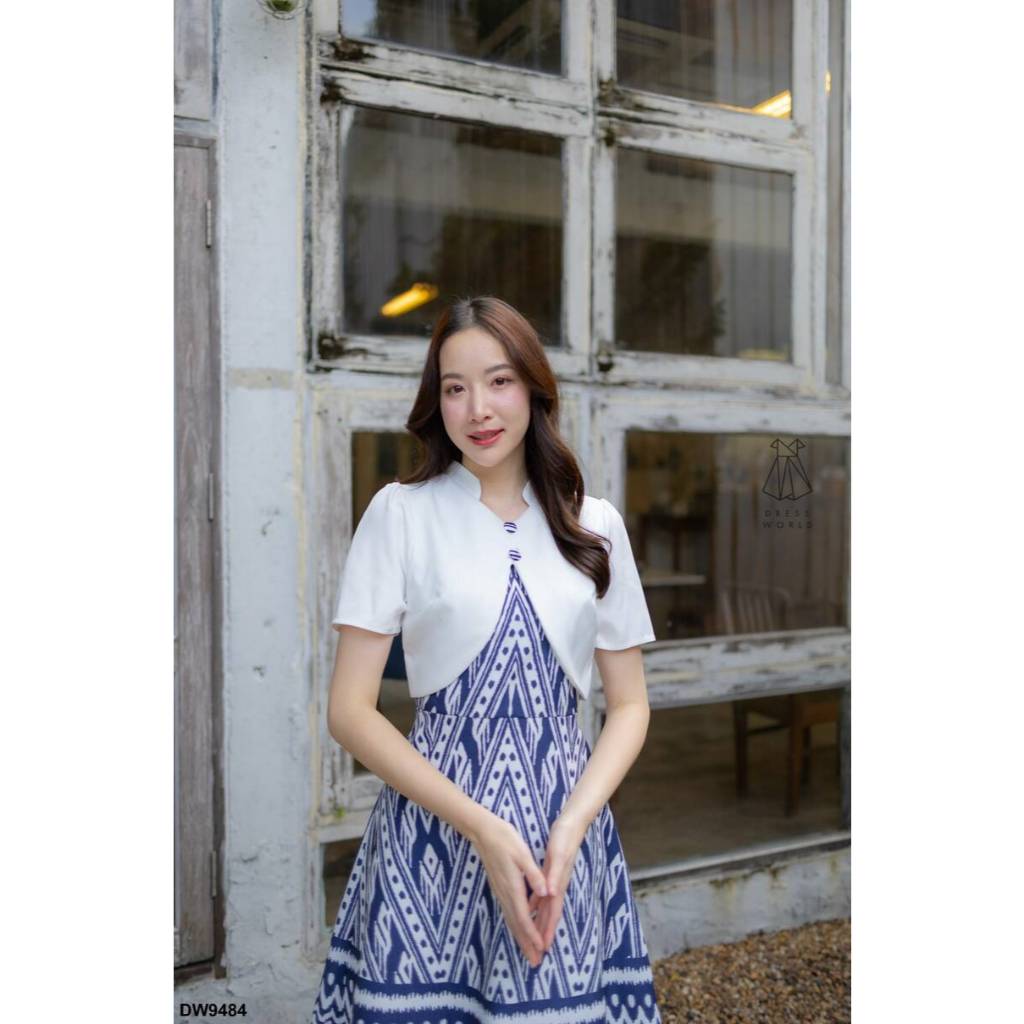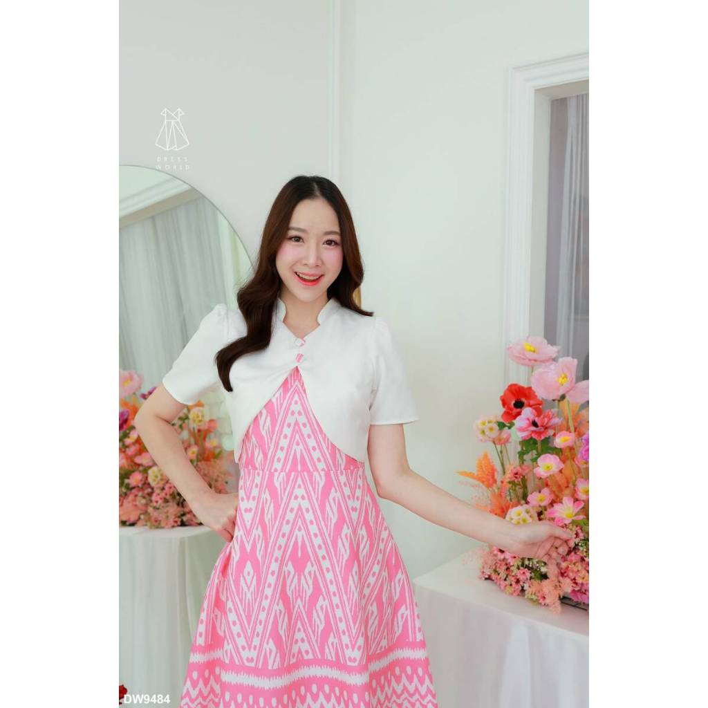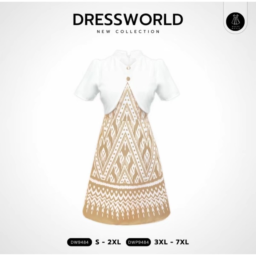 {S-7XL} 9484 งานป้าย Dress World เดรสสั้นทรงบาน คอจีน ช่วงล่างลายไทย เดรสทำงาน